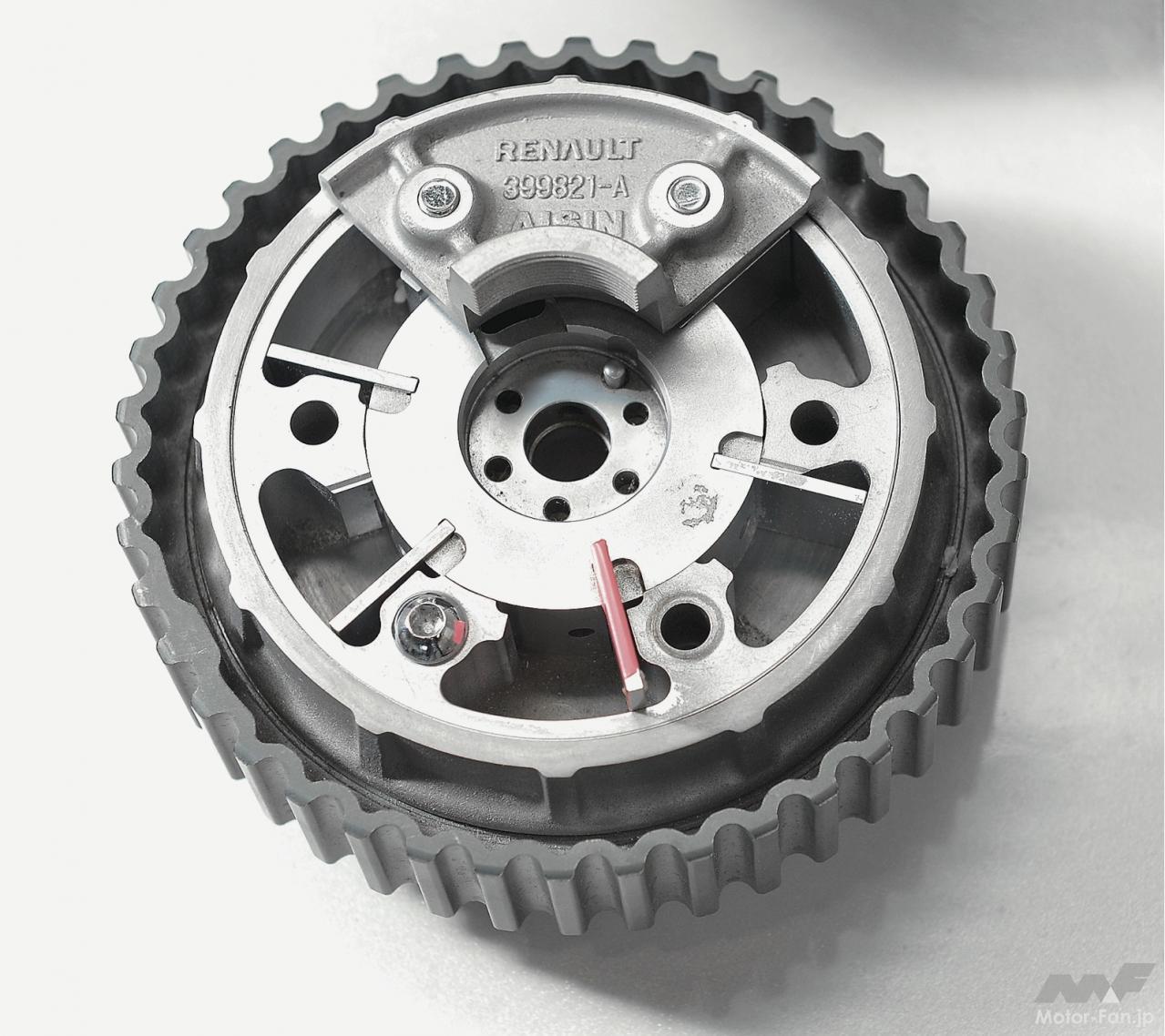 ちなみに、下の写真(とトップの写真)で紹介しているトヨタのVVT-iEと呼ばれる電動式VVTでは、サイクロイド減速機構という一段で大減速が可能で、なおかつ精密な位置決めという制御に必要な、ゼロバックラッシュ(つまりガタがない)という要素を持つ特殊な機構が使われている。もちろん、そのメリットは絶大で、可変幅、応答性は油圧ベーン式を大きく上回り、そして角度を自在に操れるなど制御の自由度も格段に高まるのだが、それを制御するECUにも高い能力が必要となり、実装されるソフトウェアの高度化(当然開発工数も増加)が求められるということも忘れてはならない。