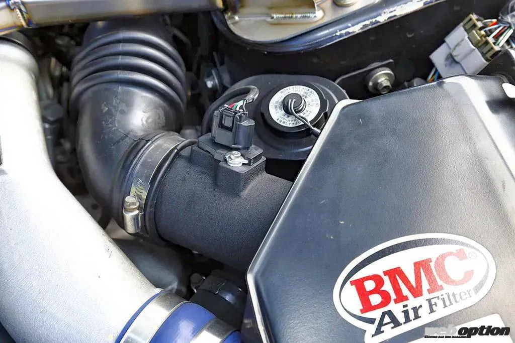 インテークは、ノーマルボックス+BMCスポーツフィルターのコンビでフレッシュエアのヒートを抑えながら十分な吸気環境を確保。また、エアフロセンサーには高精度のR35用を、インジェクターには霧化特性に優れた12ホール式をそれぞれ組み込んでいる。