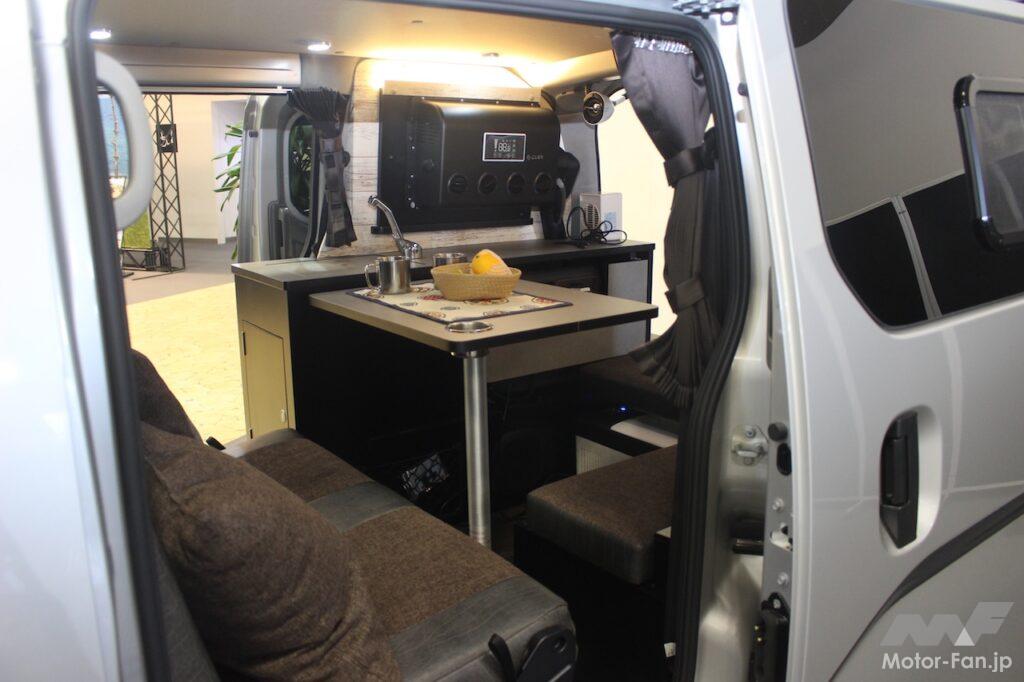 ブラックとホワイトを基調とした室内は、シックな仕立てで、LEDの間接照明により洗練されたムードが漂う。装備も充実していて大人2人の就寝に対応するベッドマット、走行充電システム、テーブル、調光LEDルームライト、遮光ロールスクリーンカーテン、ギャレーシンクセット、シート下収納、集中スイッチパネル、サテライトスピーカー、12VのDCエアコン、2304Whポータブルバッテリーなどを用意する。