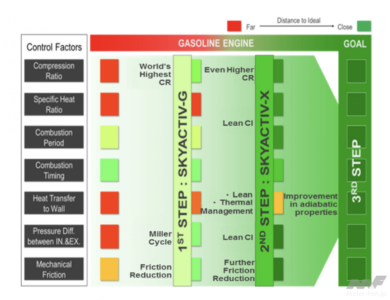 ガソリンエンジンにおいては空気の量を増やす=希薄燃焼を行なうことが容積比(幾何学的圧縮比)の向上と共に重要であり、それがマツダのSKYACTIV理論の根幹でもある。圧縮比の向上はノッキングという限界があるため、ストイキオメトリーを超えた超リーンバーンこそが、CO2削減要求に対するエンジンの採るべき最良の方策。圧縮比16.3のSPCCIのSKYACTIV-Xエンジンでは、比熱比の向上が成功のカギのひとつとなった。