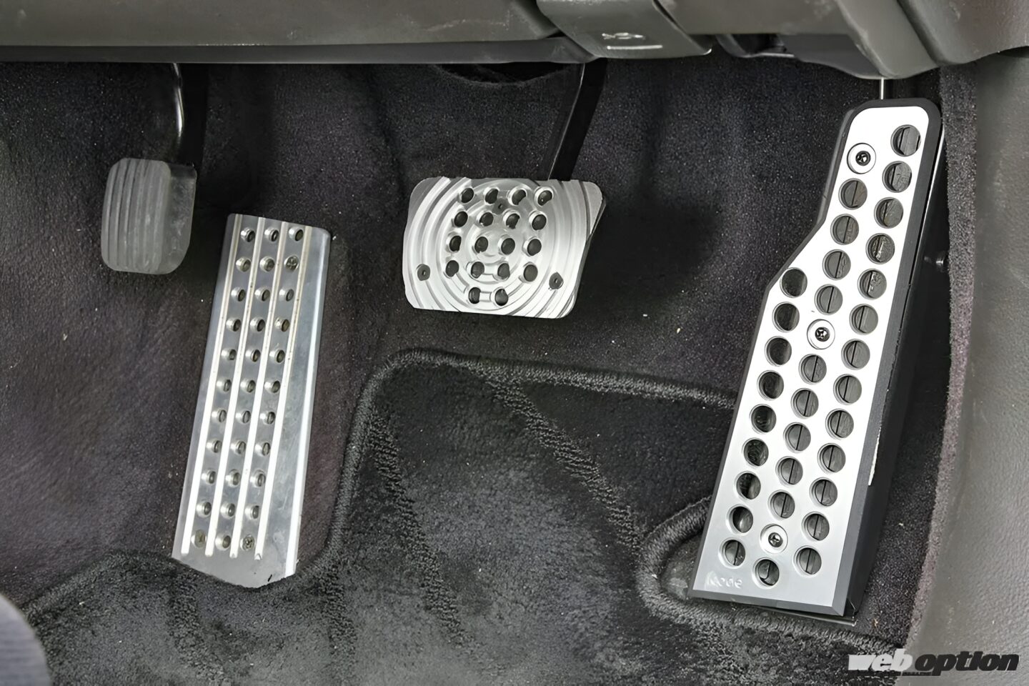 ホイールは19インチのBBS RE-V(F8.5J R9.5J)で、タイヤにはアドバンネオバAD08(F245/35 R275/30)を合わせる。ブレーキ系は、オリジナルのサーキットスペックパッドとテフロン製ブレーキホースキットで強化済みだ。