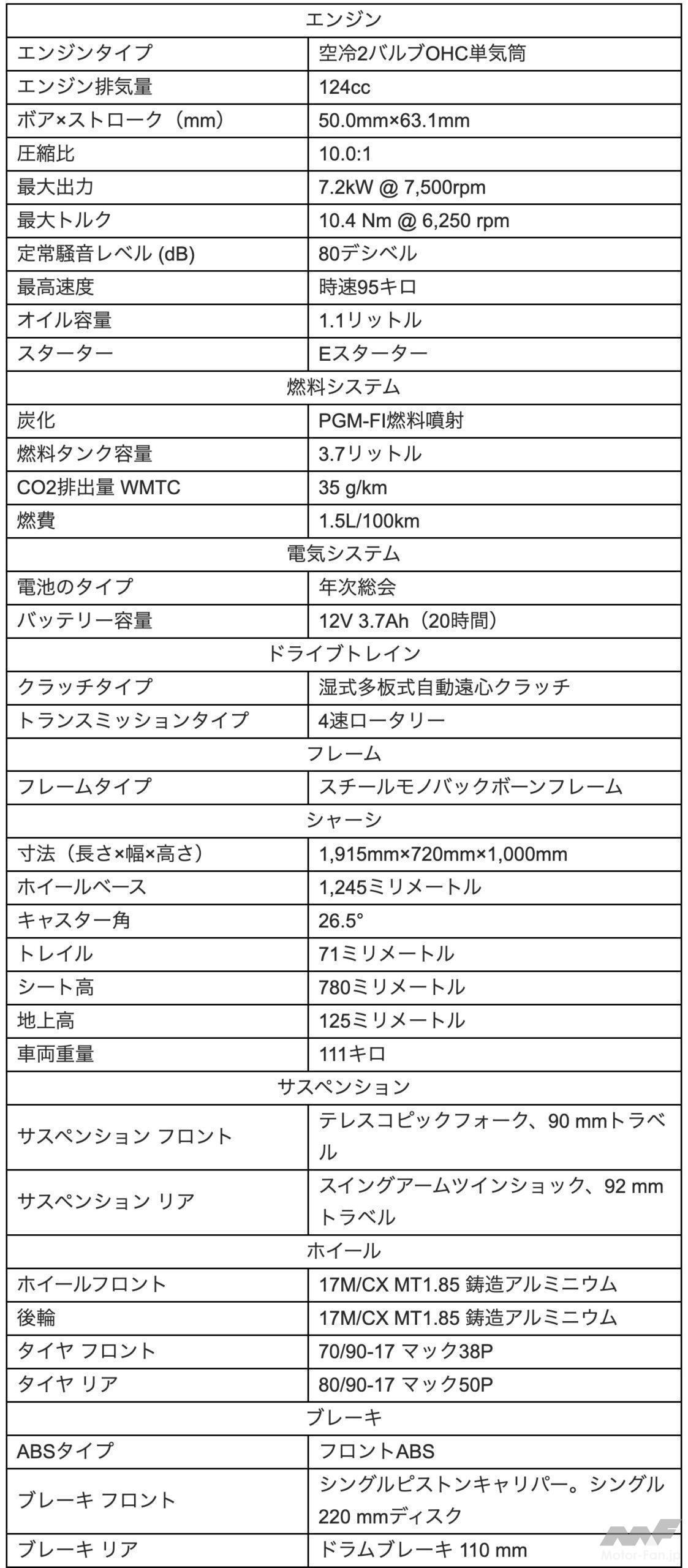 124ccのエンジンは、最大出力7.2kW/7,500rpm、最大トルク10.4Nm/6,250rpmを発揮し、スムーズな走行性能を実現。4速ギアボックスは自動遠心クラッチを採用し、クラッチレバーなしで簡単にシフト操作が可能なことは変わりない。