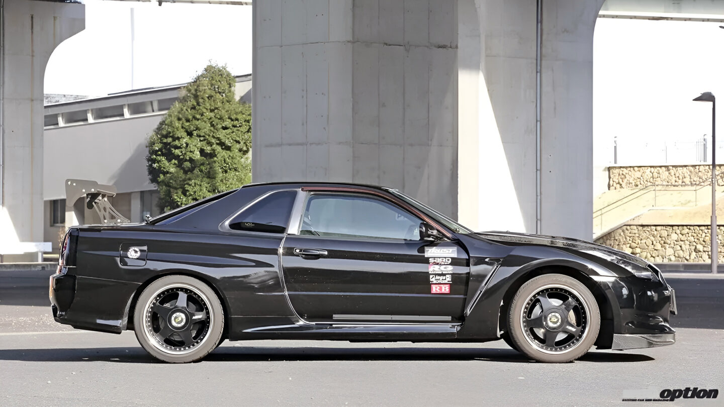 車両をチェックすると、R35GT-Rのフェイススワップは一筋縄ではいかなかったことがよく分かる。ボディサイズがまるで違うため、ステーや取り付けブラケットをワンオフ製作し、一部フレームもカットされている。R35のフロントセクションをR34にスッポリと被せて、各部の辻褄を合わせたという感じだが、フェンダーは車幅の違いから自然とブリスター仕様に見えるから面白い。
