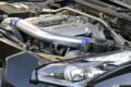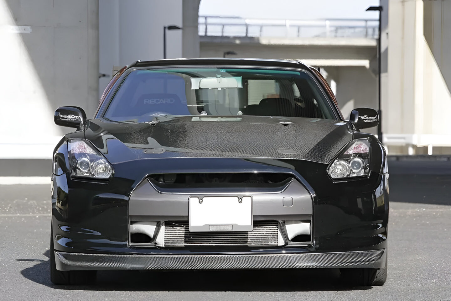 ボンネットとアンダーリップは純正形状のカーボン製を投入。バンパー開口部内にマウントする前置きインタークーラーがチューンドを物語る。この角度で見たらフルチューンR35の印象だ。
