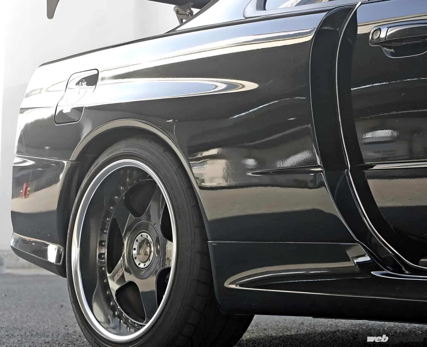 フロントの超ボリュームとバランスを取るために、リヤは純正フェンダーの上にもう一枚純正フェンダーをオフセット装着させることでブリスター化。後端のメッシュ処理なども含めて完成度は高い。