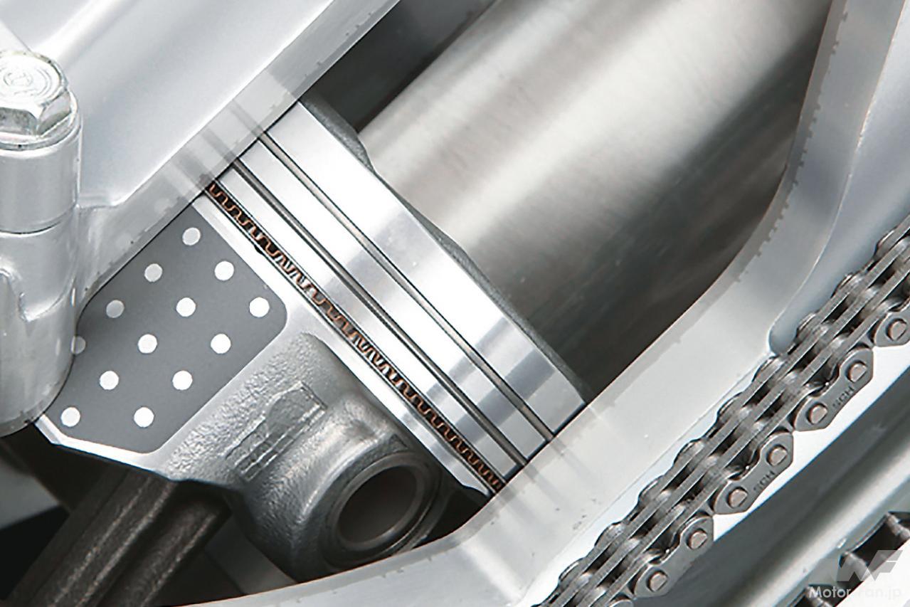 レーシングエンジンではピストンスラップが原因の音の発生など問題にしないため、ひたすら軽くするために超「ミニスカート」である。逆に超「ロングスカート」なのは2ストロークエンジン。2ストロークはシリンダー壁面に穿たれたポートから吸気と排気を行ない、ピストンの上下動で吸気タイミングを制御することから、スカートに一定以上の長さがなければエンジンが動かないのだ。吸排気ポートはボア円周上に複数空いているため、長いスカートもピンと平行な側だけでなく、ぐるりと一周に及んでいる。