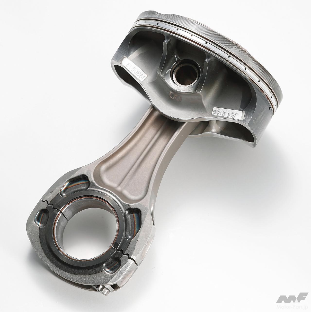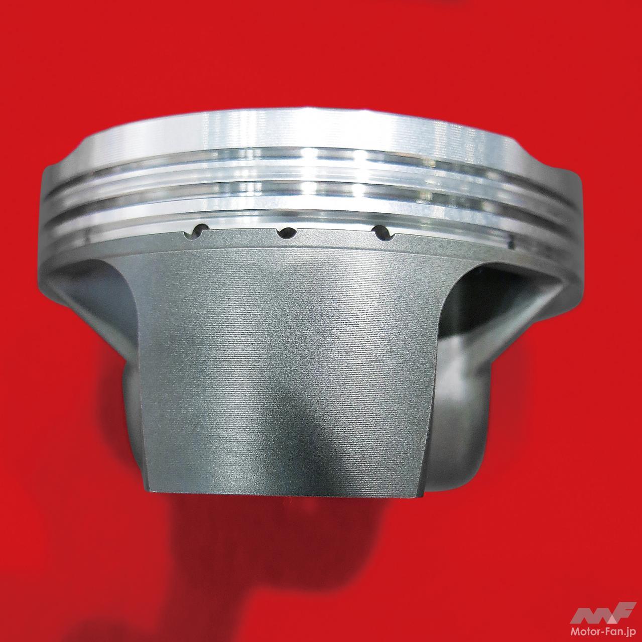 ピストン頂部から側面に目を移せば、そこにはスカートと呼ばれる円筒形状の出っ張りがある。これはコンロッドの傾きによってピストンがピストンピンを中心に首を振ってボア壁面に衝突するピストンスラップを防止するのが目的。