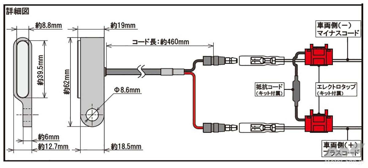 点滅部は高輝度なLEDを6灯配置することで、昼夜問わずに優れた視認性を発揮。高輝度ながら、1灯あたり約0.5W(12V時)という低消費電力も実現。本製品はコード長を余裕ある約460mmに設定しており、コードを長く確保する必要のある車両にも使用可能。