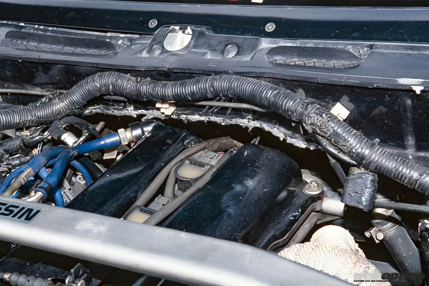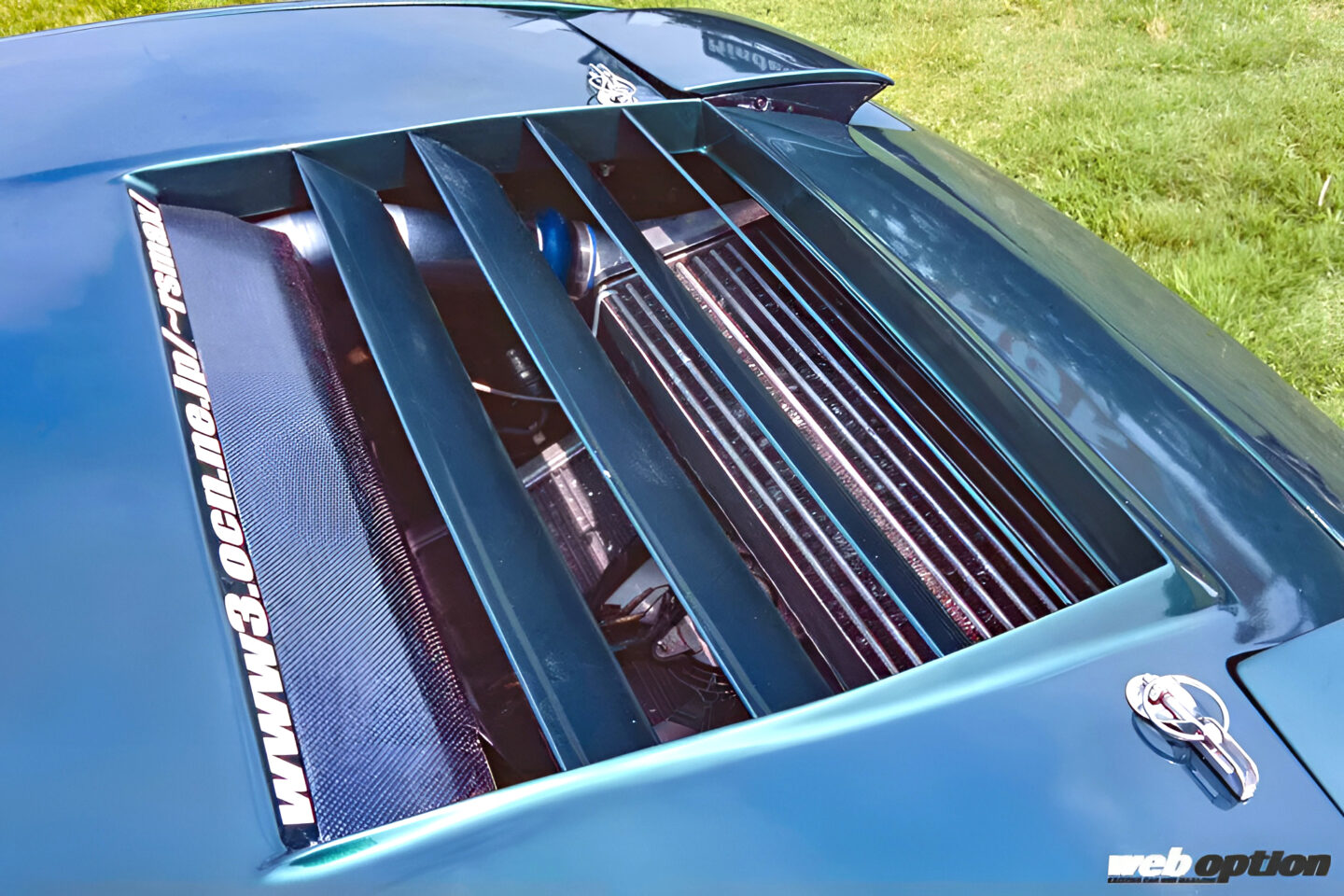 エンジン本体は腰下ノーマルでインテーク256度、エキゾースト264度カムを組み込む。スロットルはパルサーGTi-R用の4連スロットルを加工流用。タービンはHKSのGT2835を合わせ350psを発生させる。