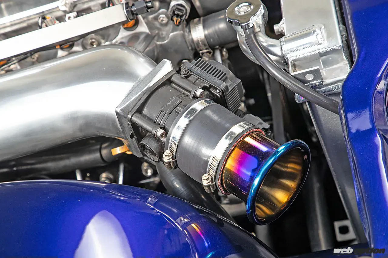 吸気系にはトラストのサージタンクやチタン製ファンネルを装着。排気系には、ワンオフで製作したステンレス製等長EXマニが備わり、鈍い焼色が美しく光る。