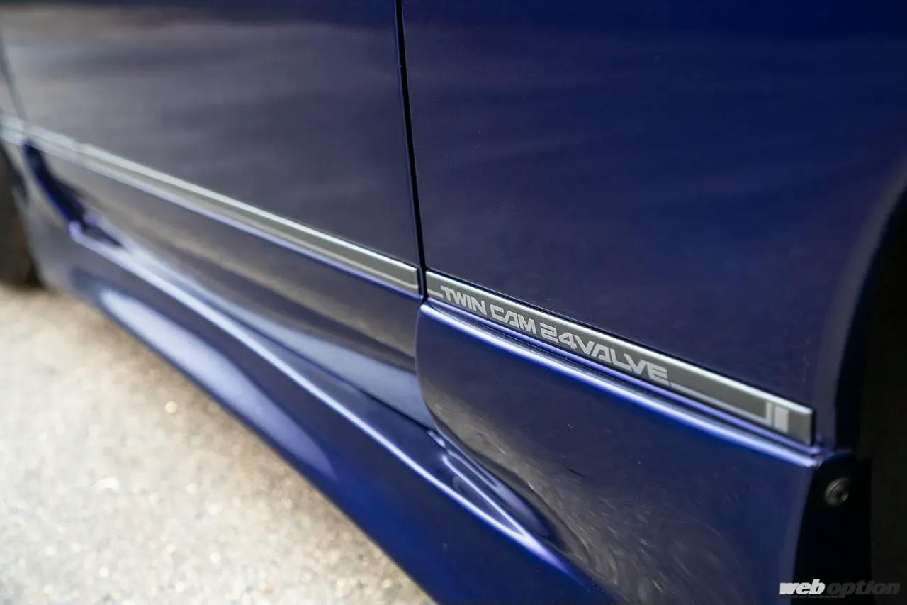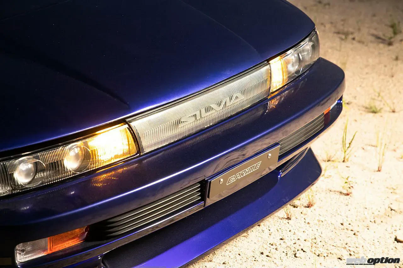 一方のエクステリアは、ヘッドライトもバンパーもS13前期の姿をキープ。純正リヤスポイラーの取り付け位置を若干後ろにスライドさせたり、ボディサイドに装着される“TWIN CAM 16VALVE”のエンブレムを“24VALVE”に変えたりと、同じS13オーナーにこそビビっとくる技を盛り込む。