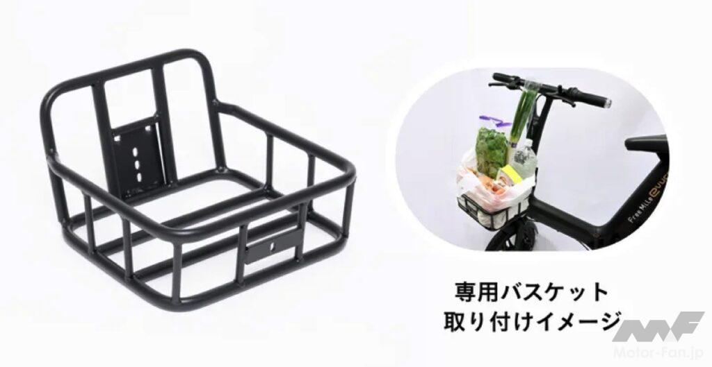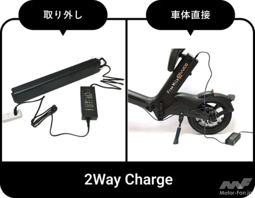 バッテリーは取り外し充電と直接充電の2way充電が可能であり、取り外し充電ではバッテリーを簡単に取り外せる設計で、車体を屋外に置いたまま充電可能である。直接充電では、本体に刺したまま充電ができるため、取り外す手間なく充電が完了する。さらに、通勤や買い物、お出かけに便利な専用バスケットをオプションで装着可能である。