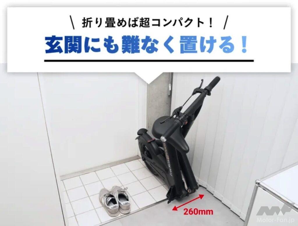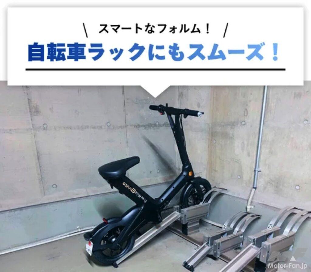 特徴は、「IP65防水」「折り畳み」「スマートフォルムにより屋内外を問わずあらゆる場所で保管が可能」という点である。IP65防水性能は雨の日でも車体をそのまま屋外に置ける安心感を提供。車体を折り畳むことで、玄関やオフィスの室内にスッキリ収められるコンパクト設計となっており、駐輪場がないオフィスにも持ち込め、省スペースで利便性を高めている。マンションやオフィスビル等の自転車ラックにも難なく駐輪することさえ可能だ。