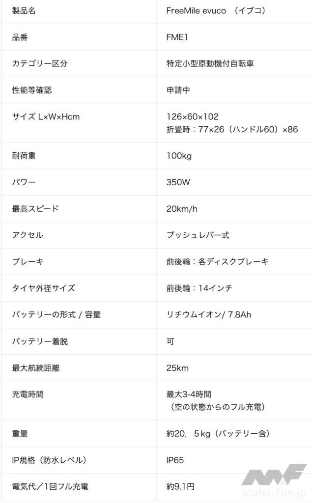 スペックは、サイズが126×60×102cm(折畳時:77×26×86cm)、耐荷重が100kg、パワーが350W、最高スピードが20km/h、バッテリー容量が7.8Ah、最大航続距離が25km、充電時間が最大3-4時間、重量が約20.5kg(バッテリー含む)となっている。