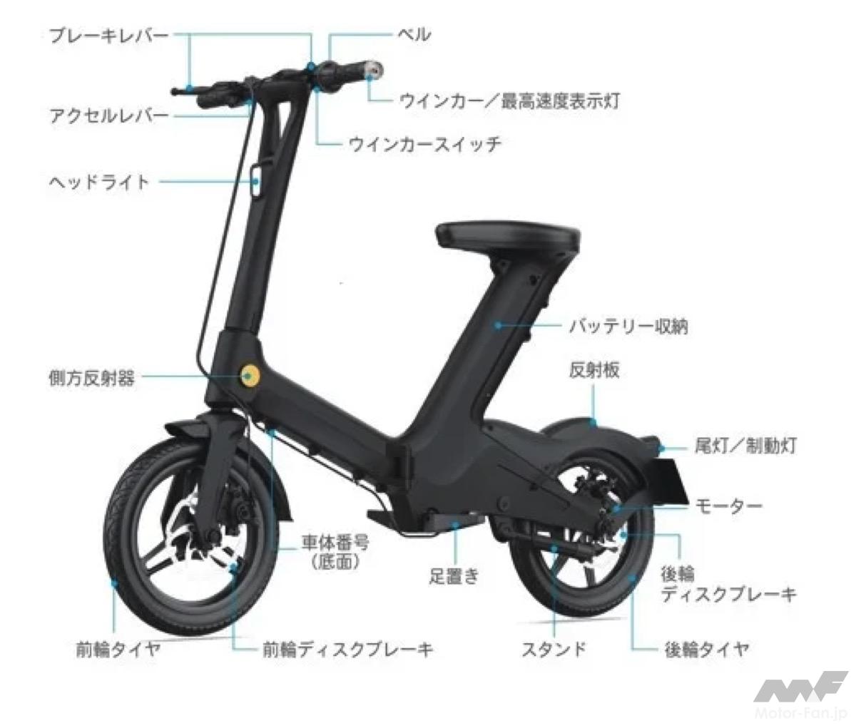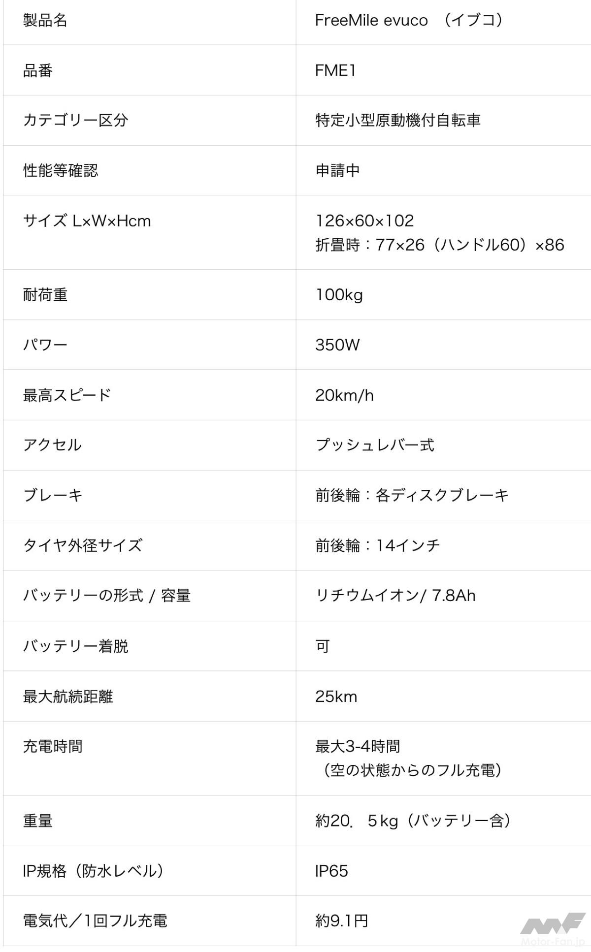 スペックは、サイズが126×60×102cm(折畳時:77×26×86cm)、耐荷重が100kg、パワーが350W、最高スピードが20km/h、バッテリー容量が7.8Ah、最大航続距離が25km、充電時間が最大3-4時間、重量が約20.5kg(バッテリー含む)となっている。