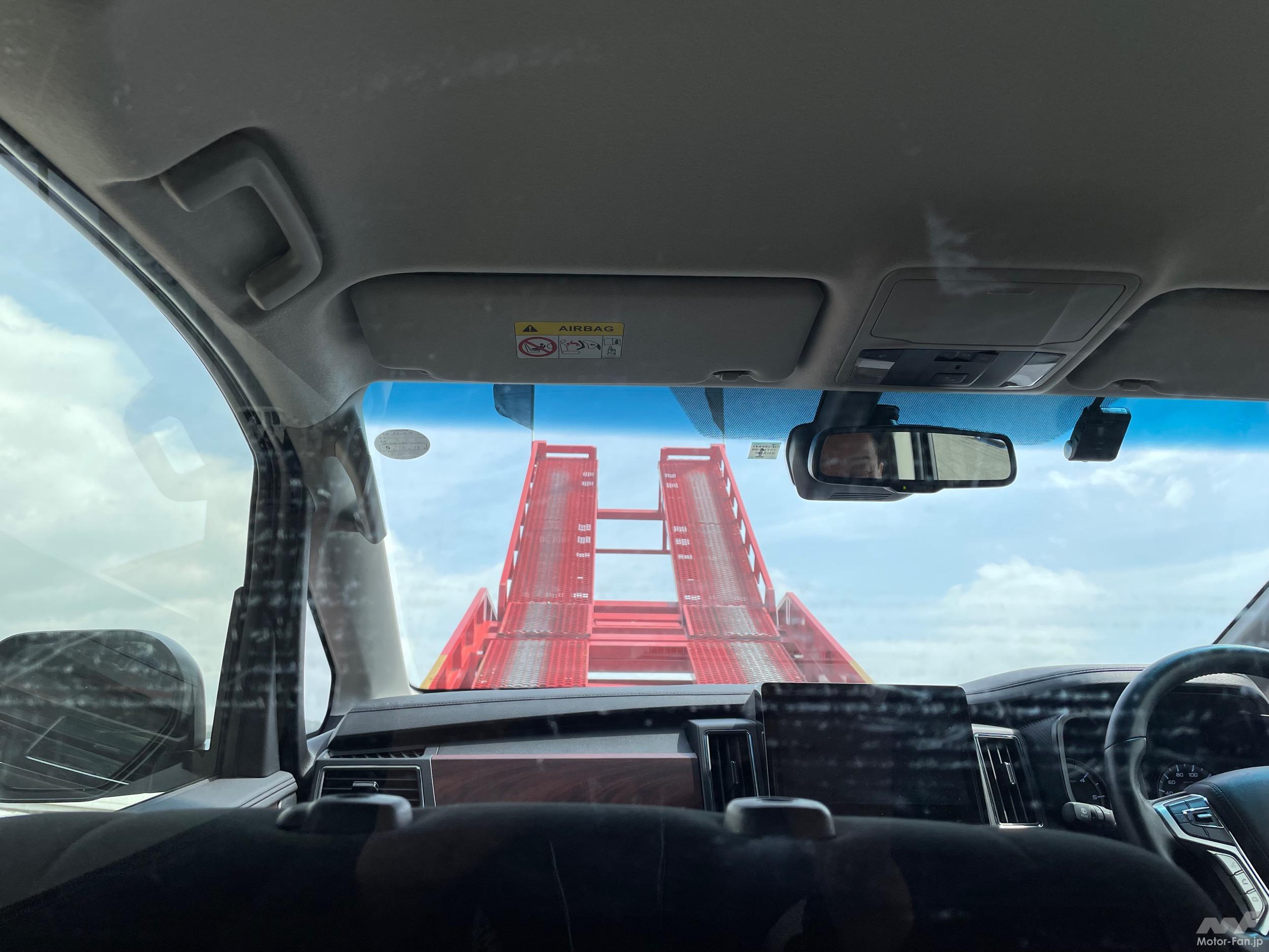 いよいよ、最大斜度45°の急坂登坂に挑戦。デリカD:5の低回転から最大トルク380Nmを発生させる2.2Lディーゼルエンジンの回転数は2000〜2500回転、アクセル開度は1/3程度で軽く踏み込めば急坂を登っていく。斜面の途中で一時停止して再スタートするのだか、ヒルスタートアシスト機能によってスムーズな坂道発進を披露した。斜度45°の最高到達点では、重力でシートに背中が押し付けられ、クルマが後ろにひっくり反ると感じるほど強烈な斜面だった。一般生活でこの急斜面をクルマで登ることはないだろう。