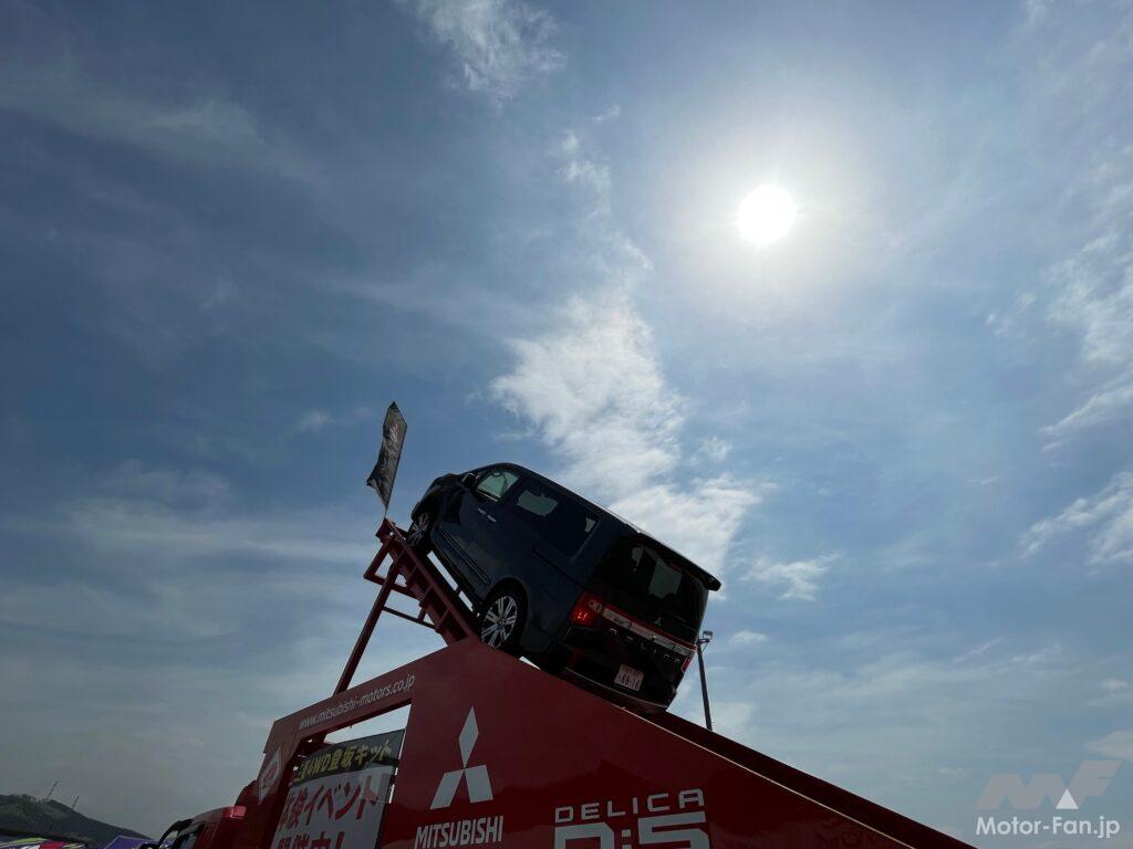 自動車の魅力を体験&体感できるイベント「モーターファンフェスタ2023」が4月23日(日)に富士スピードウェイで開催された。会場には新車試乗や自動車メーカーの出展ブースなど多彩なコンテンツで賑わっていたが、その中でも特に“体験&体感”をテーマにしていたのが三菱自動車のブースで展開されていた 「4WD登坂キット」の体験同乗。デリカD:5で最大斜度45°の急斜面に挑む様子は圧巻だ。