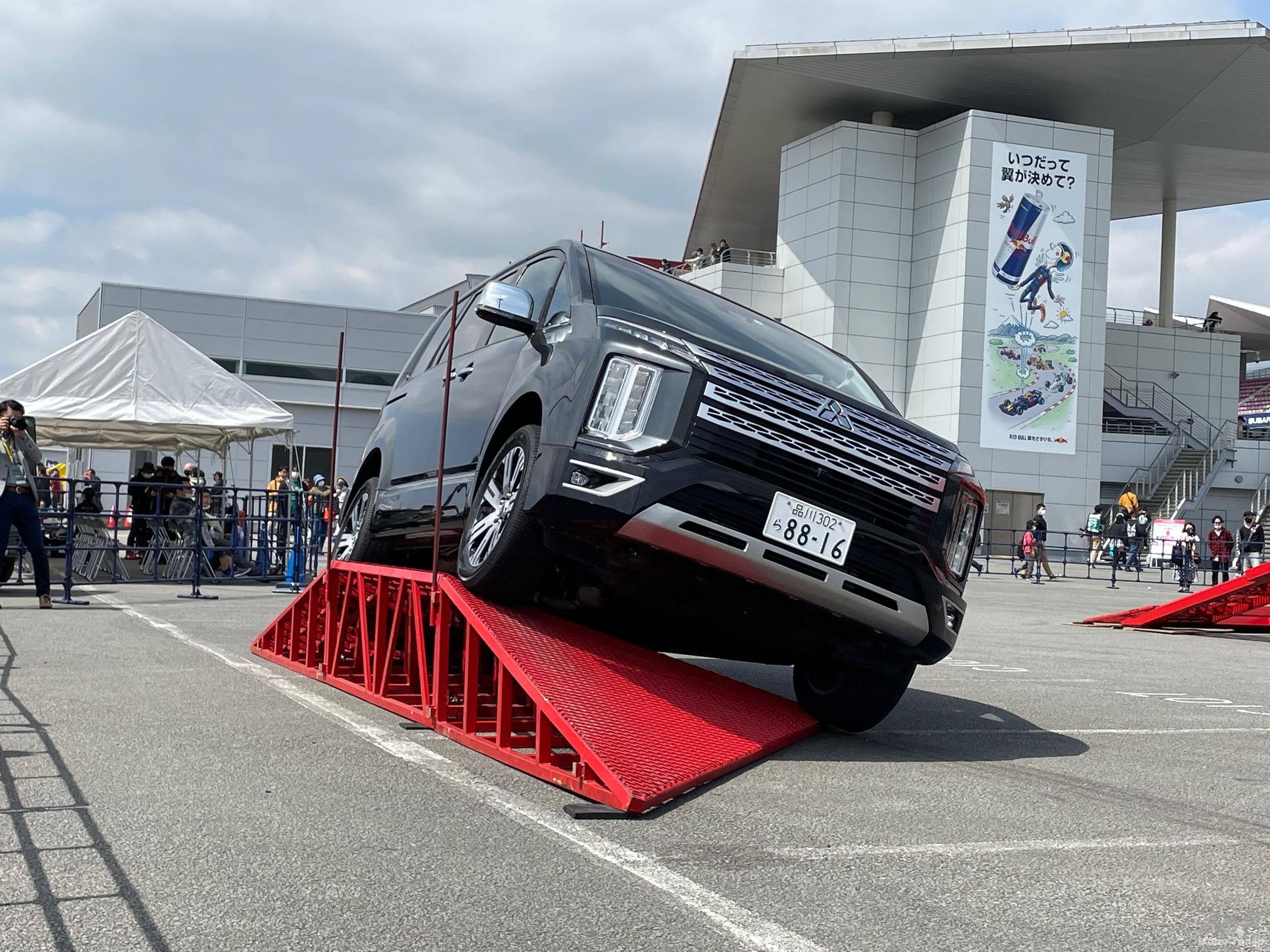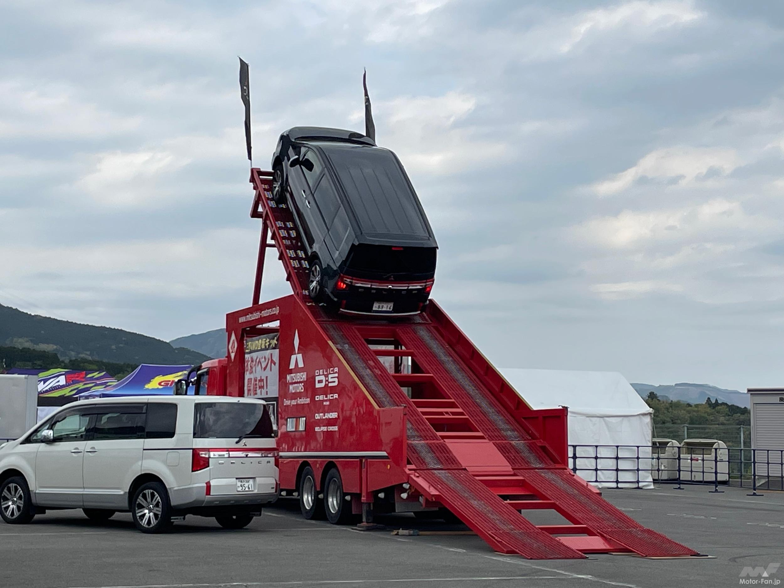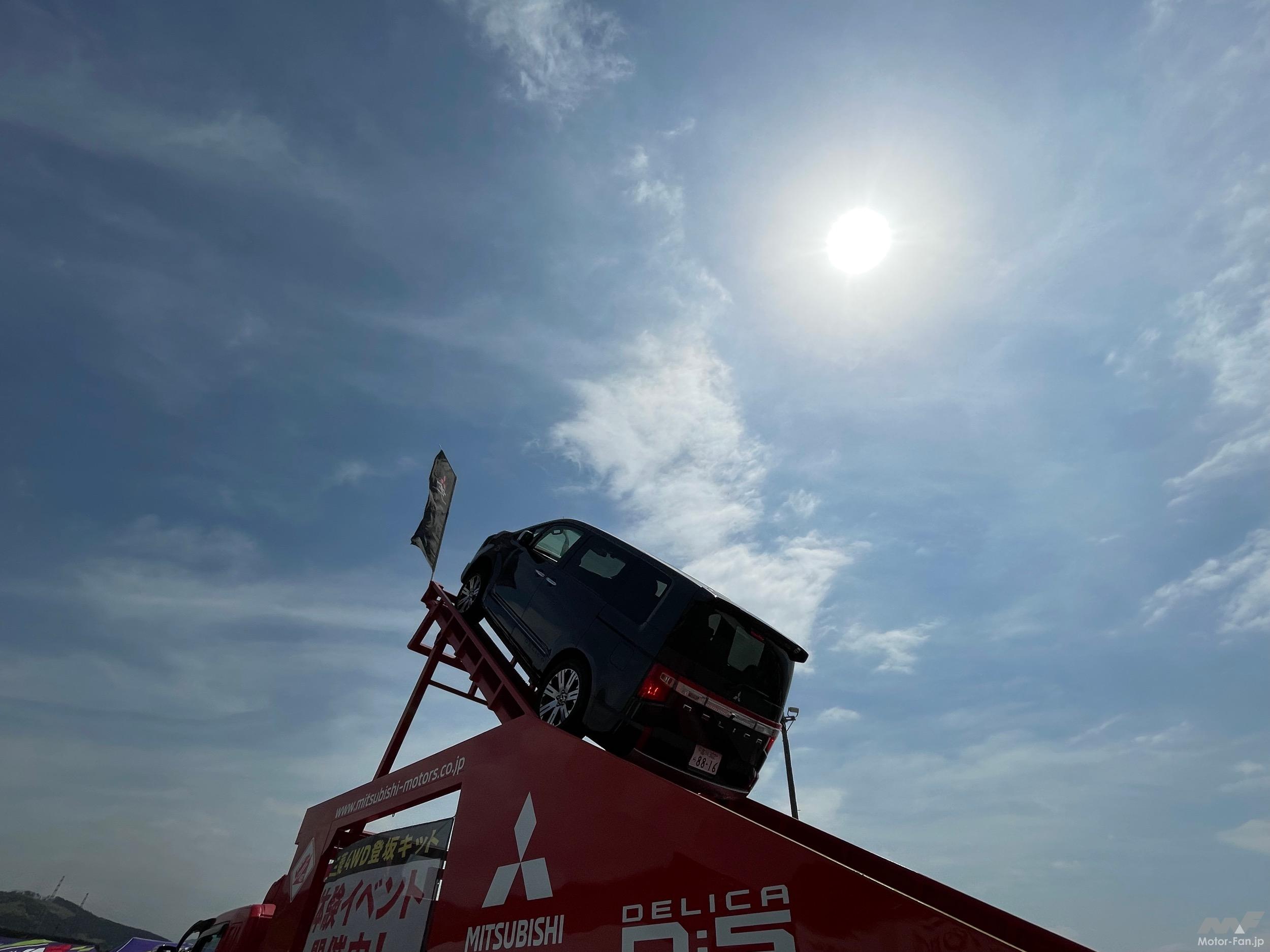 自動車の魅力を体験&体感できるイベント「モーターファンフェスタ2023」が4月23日(日)に富士スピードウェイで開催された。会場には新車試乗や自動車メーカーの出展ブースなど多彩なコンテンツで賑わっていたが、その中でも特に“体験&体感”をテーマにしていたのが三菱自動車のブースで展開されていた 「4WD登坂キット」の体験同乗。デリカD:5で最大斜度45°の急斜面に挑む様子は圧巻だ。