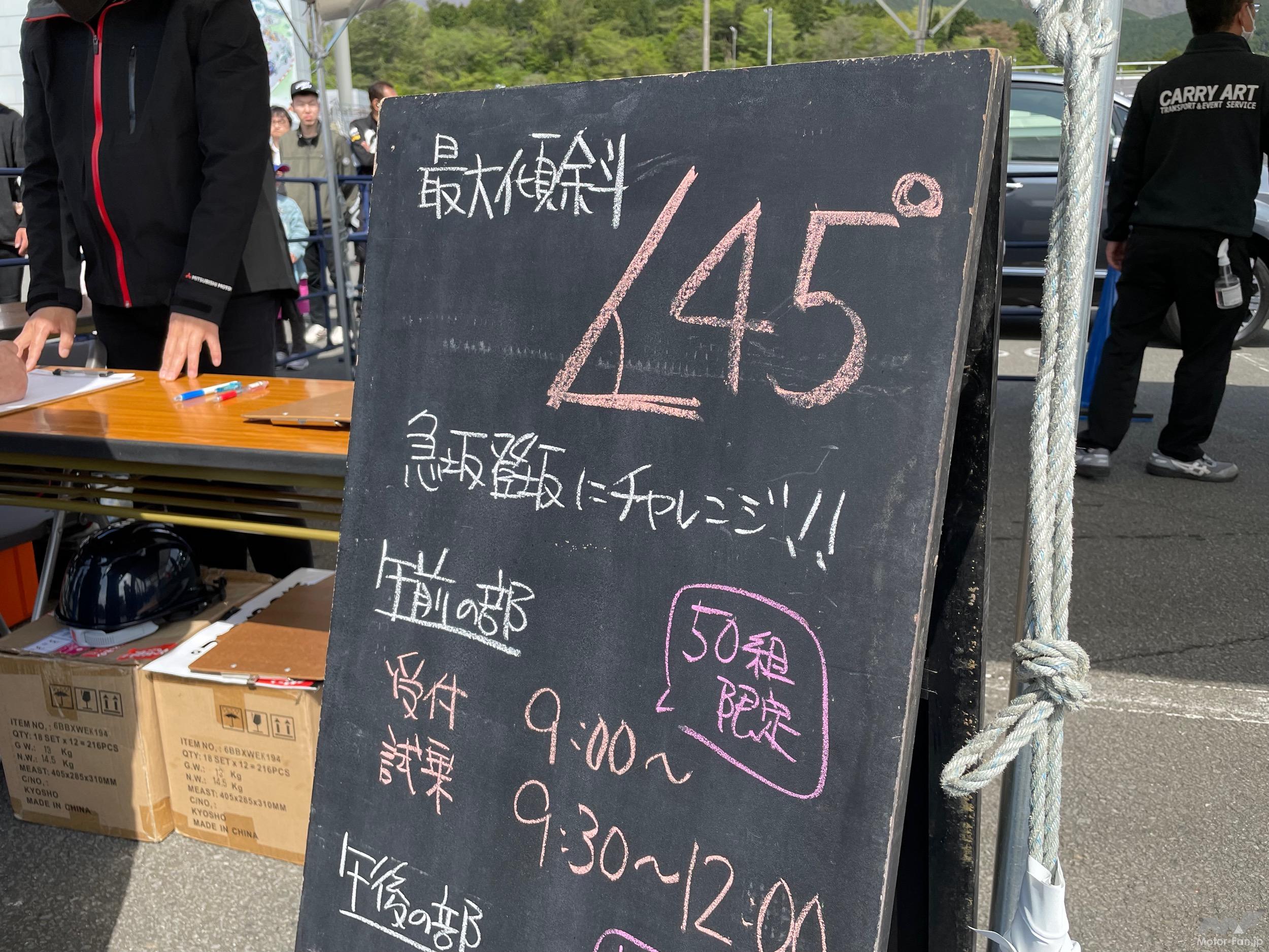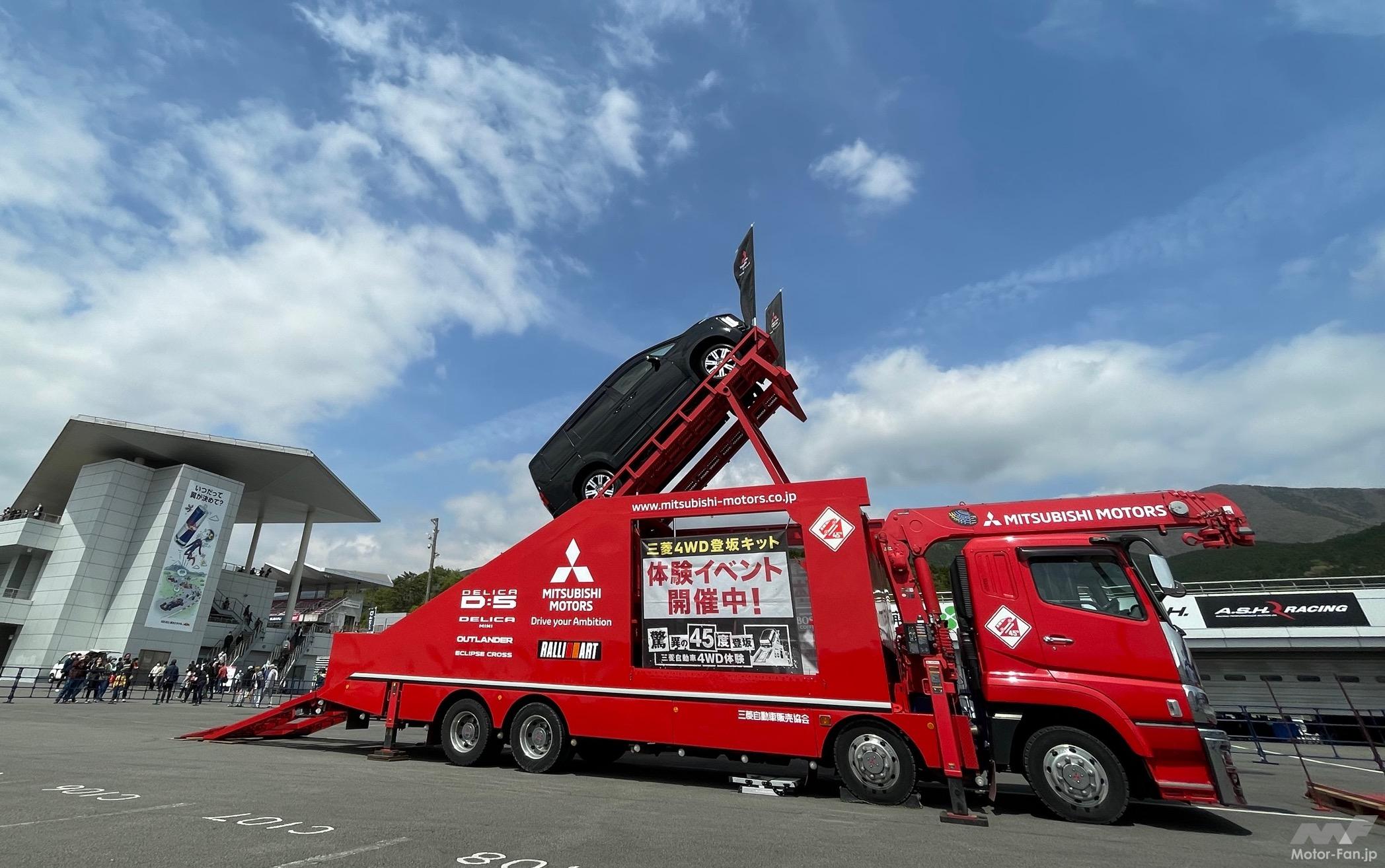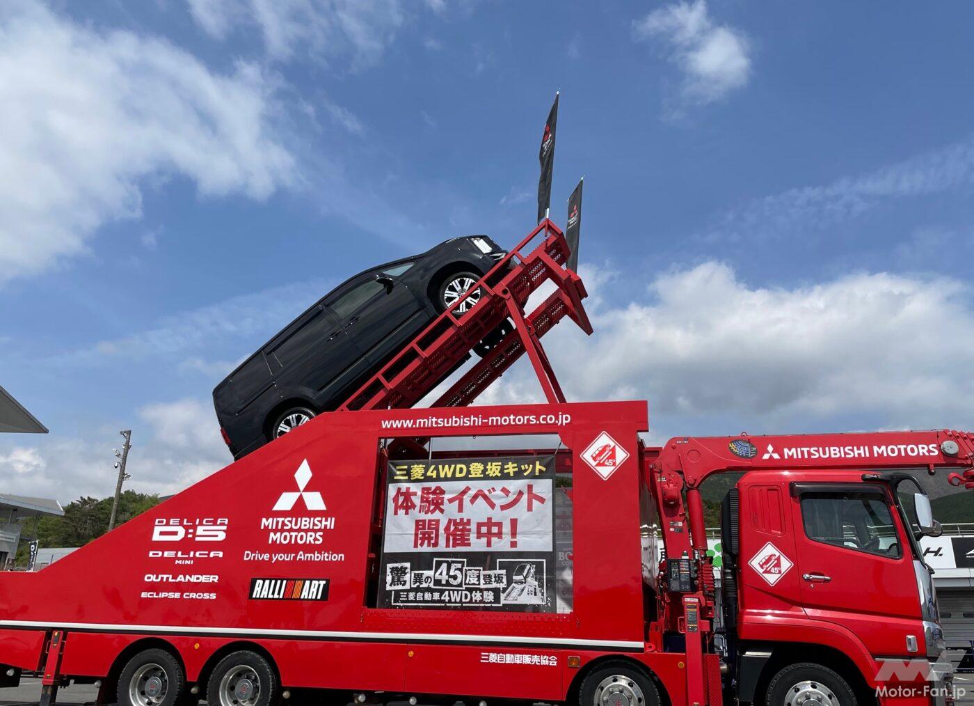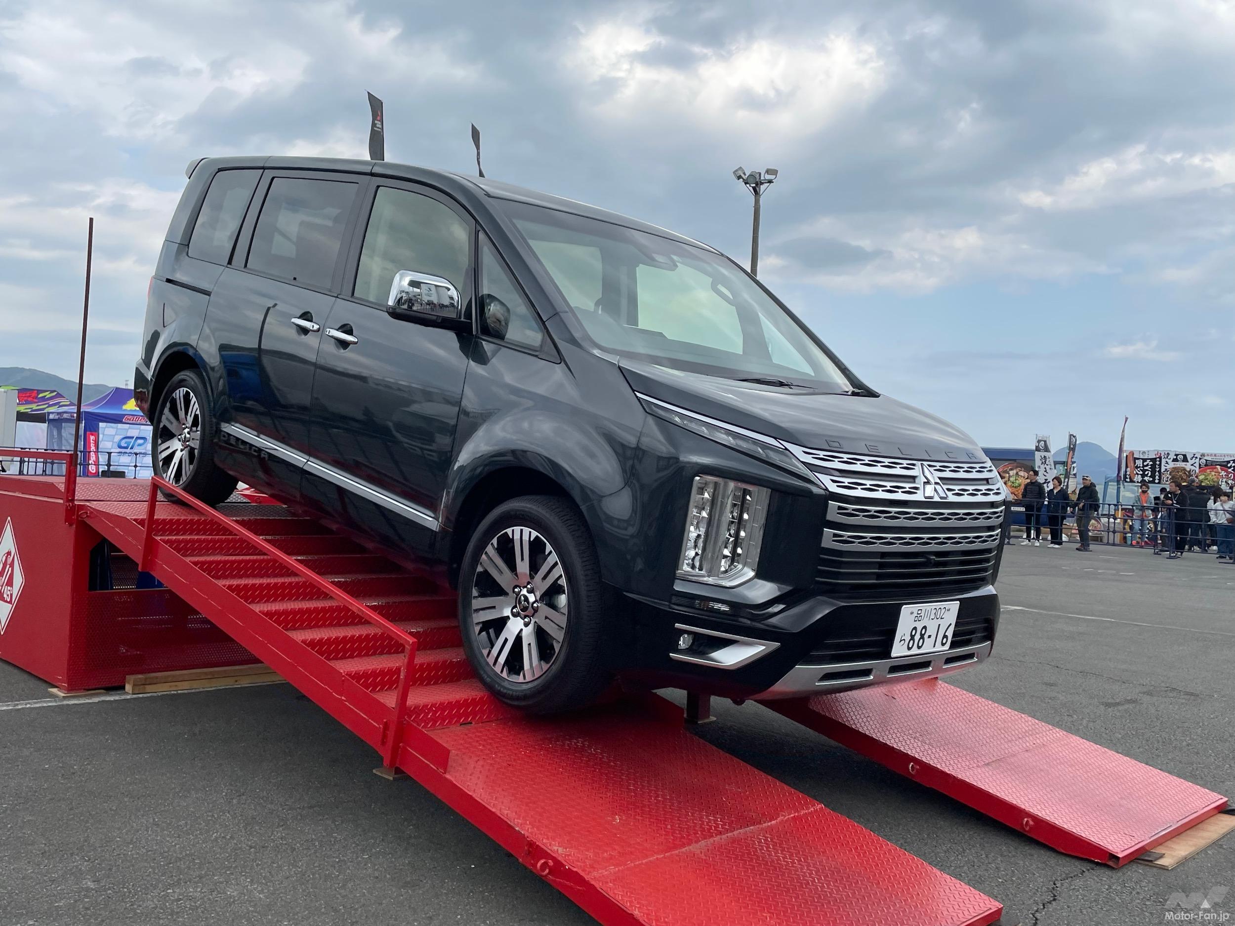 自動車の魅力を体験&体感できるイベント「モーターファンフェスタ2023」が4月23日(日)に富士スピードウェイで開催された。会場には新車試乗や自動車メーカーの出展ブースなど多彩なコンテンツで賑わっていたが、その中でも特に“体験&体感”をテーマにしていたのが三菱自動車のブースで展開されていた 「4WD登坂キット」の体験同乗。デリカD:5で最大斜度45°の急斜面に挑む様子は圧巻だ。