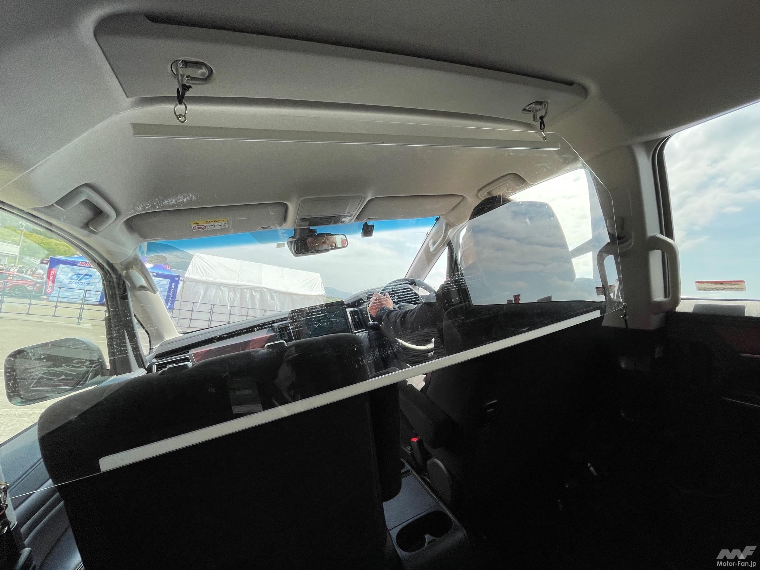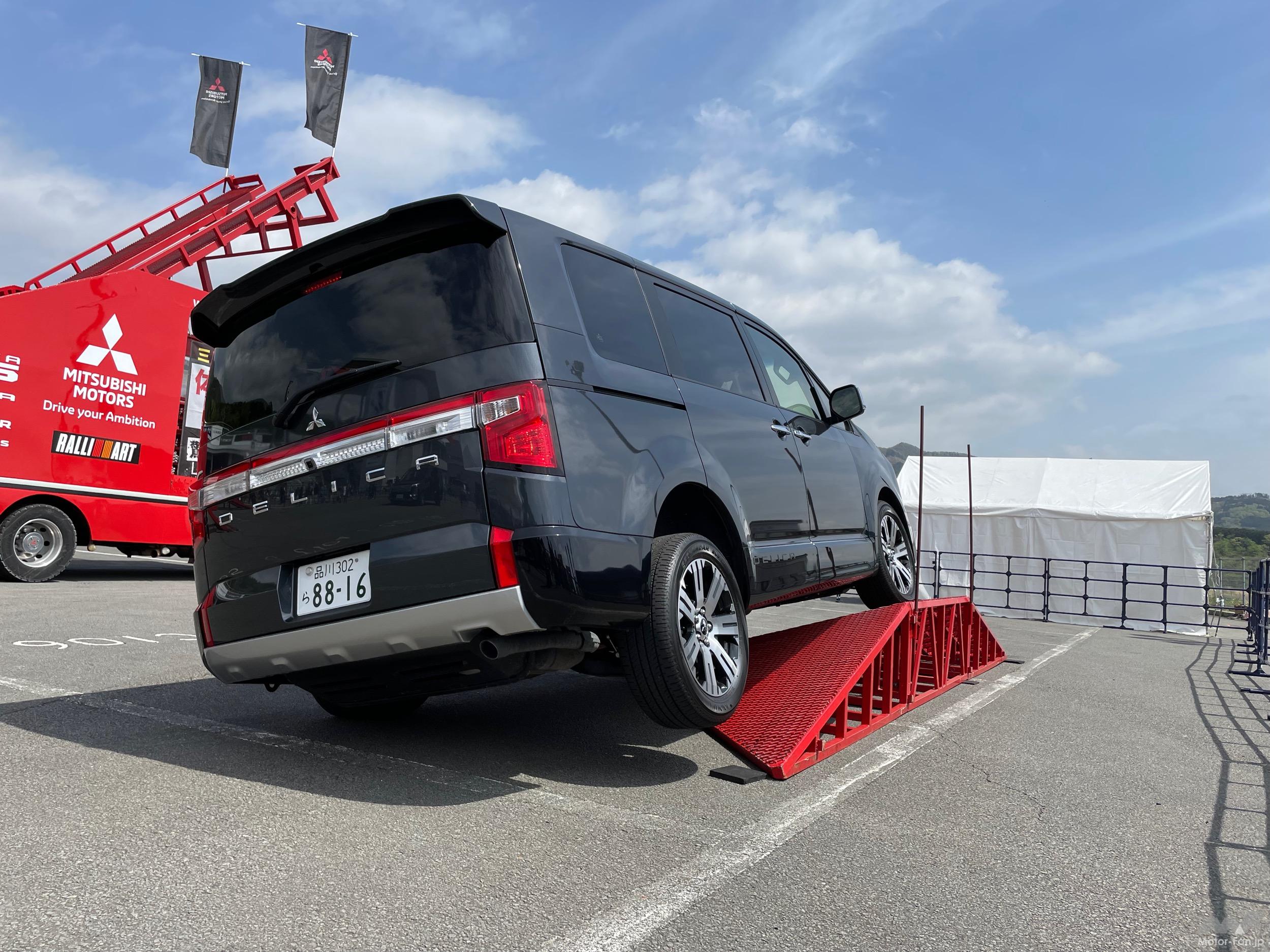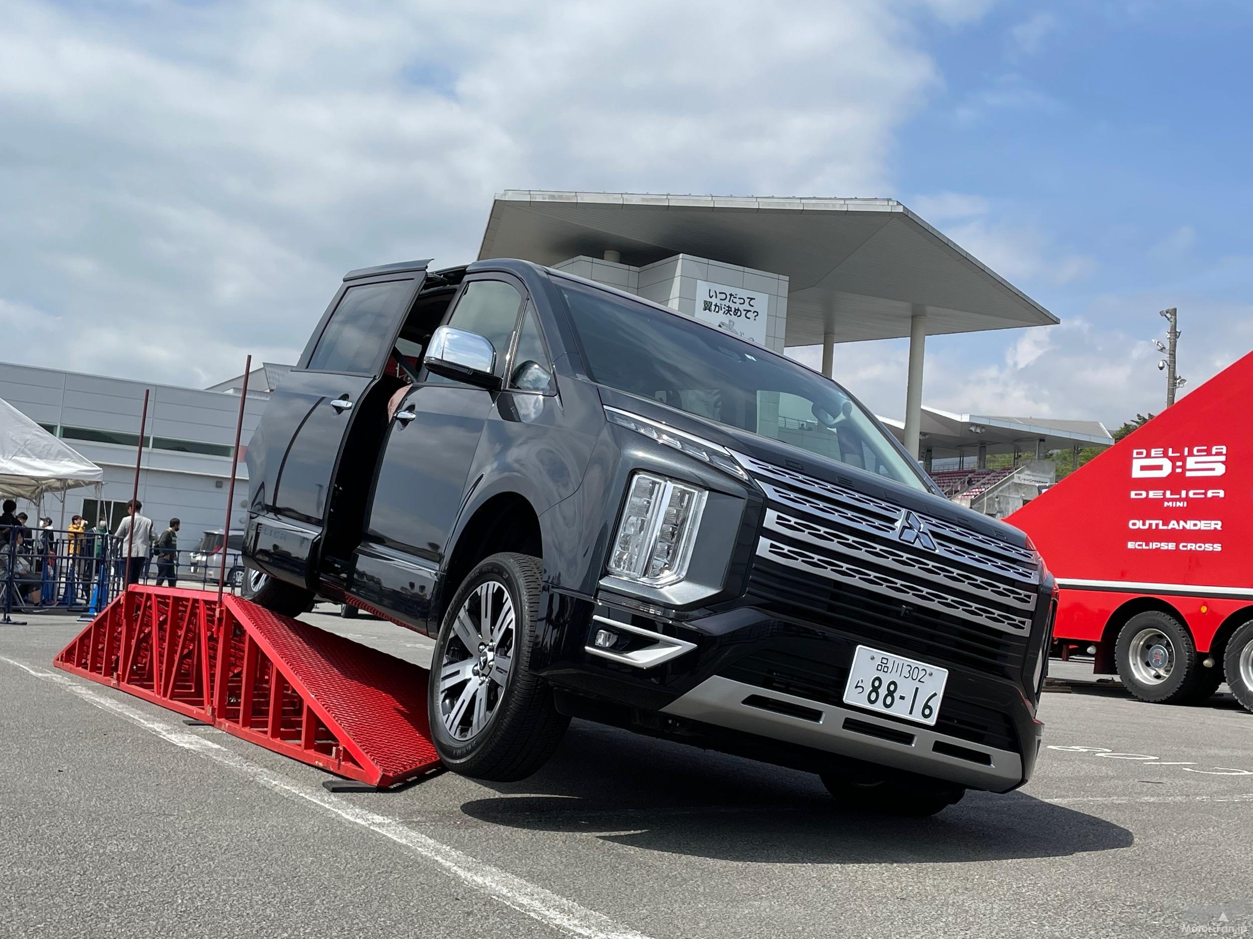 対角線状にタイヤが浮いた状態だとボディがよじれるように負荷が掛かり、通常のスライドトアだと開かなくなってしまうのだが、デリカD:5は高いボディ剛性を持っているため難なく開閉することができる。通常のミニバンであれば30°〜35°くらいの傾きが限界だが、デリカD:5は45°の傾斜でも耐えることができるといいう。