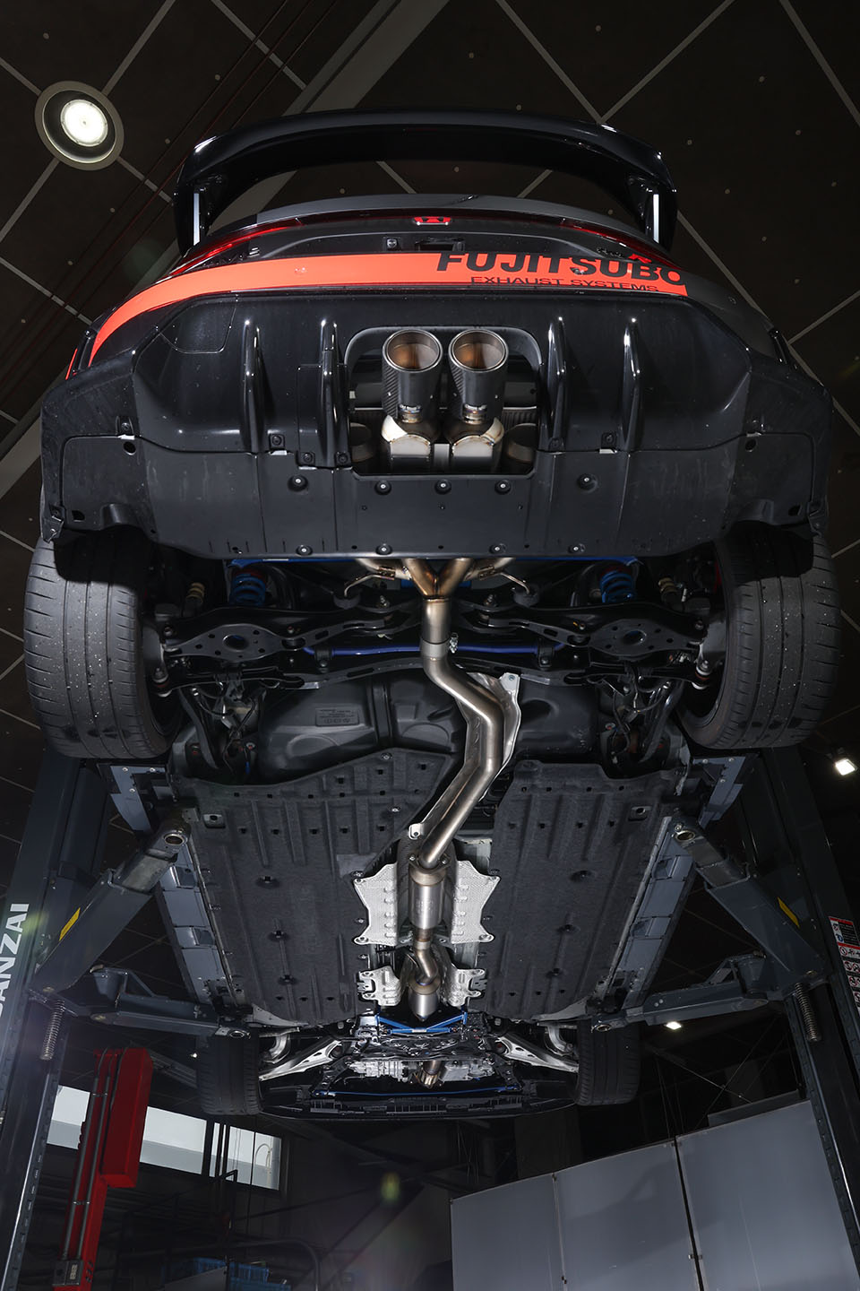 メイン70φに118φツインカーボンテールという構成はFK8用から継続しているが、よりパワフルになったFL5に合わせてツインレゾネーターの容量拡大や中間サイレンサーを追加した専用設計となっている。フルチタン素材による軽量化効果も魅力のひとつで、運動性能の向上にも寄与する。