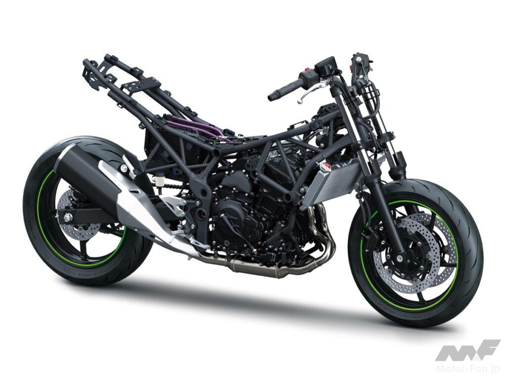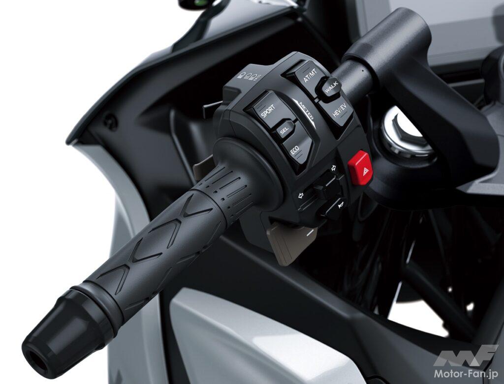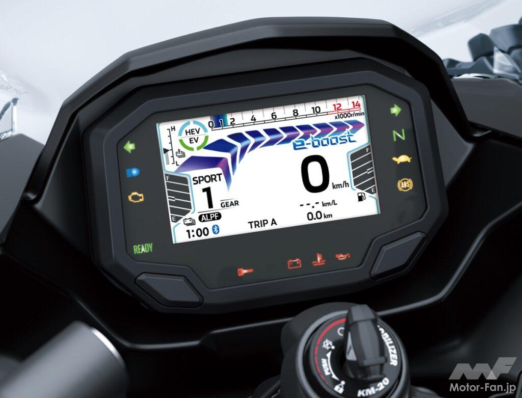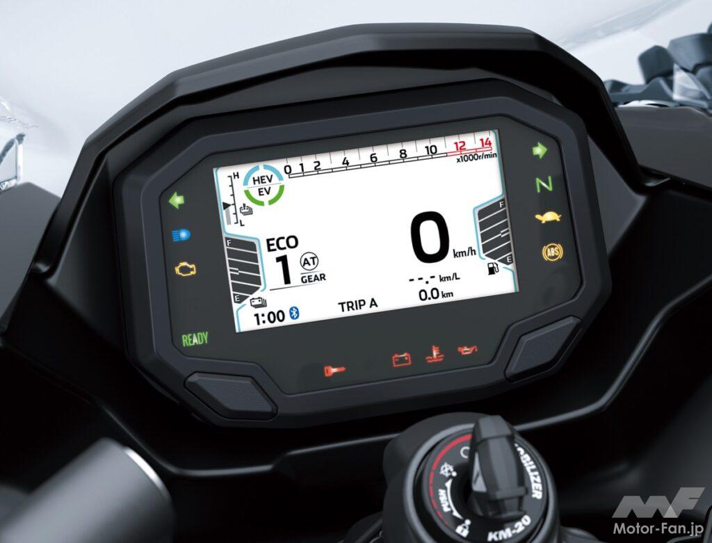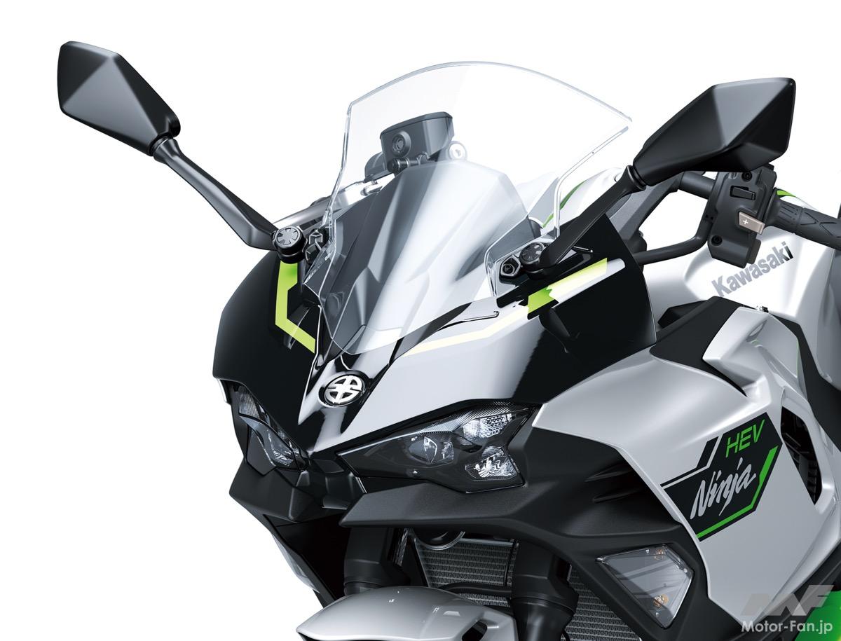 デザイン面では、ニンジャシリーズのスポーティなスタイリングとハイブリッドモデルのクリーンなイメージを融合させている。4.3インチのフルデジタルTFTカラーインストゥルメントを装備し、スマートフォン接続機能も備えている。全ての灯火類はLEDを採用し、近未来的なデザインを強調している。