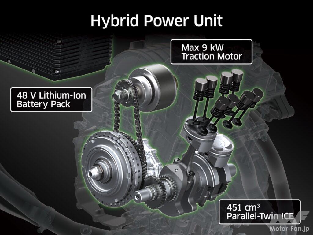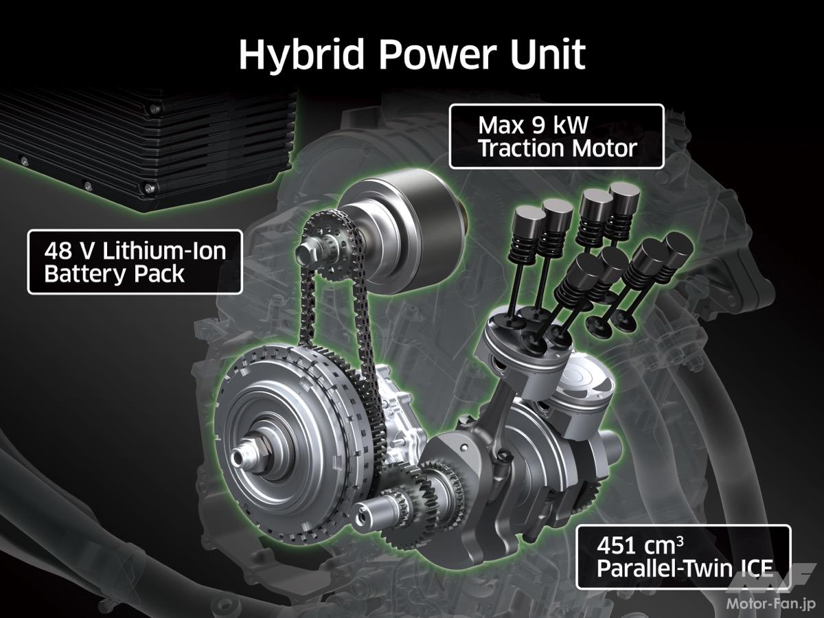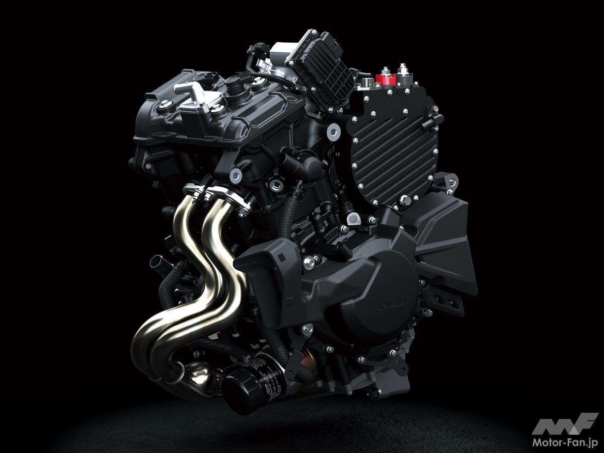 「ニンジャ7ハイブリッド」は、451ccの水冷4ストローク並列2気筒エンジンと9.0kWの水冷交流同期電動機を組み合わせたストロングハイブリッドシステムを搭載している。システム全体で最高出力51kW(69PS)/10,500rpm、最大トルク60N・m(6.1kgf・m)/2,800rpmを発揮し、エンジン単体では最高出力43kW(58PS)/10,500rpm、最大トルク43N・m(4.4kgf・m)/7,500rpmとなっている。