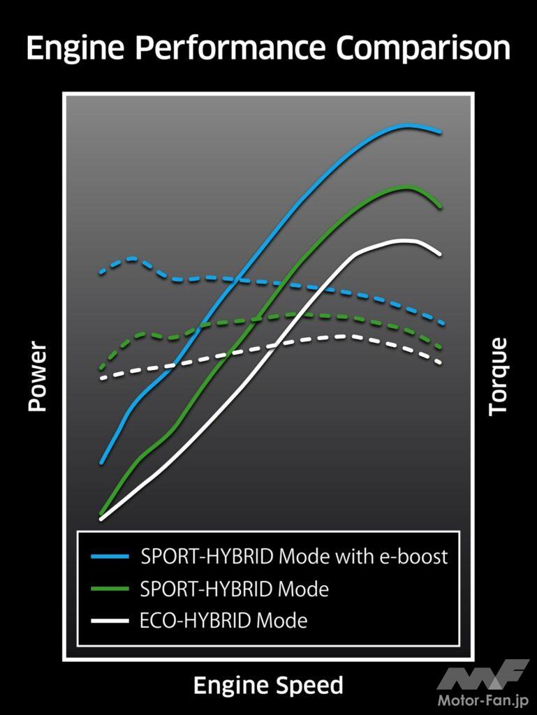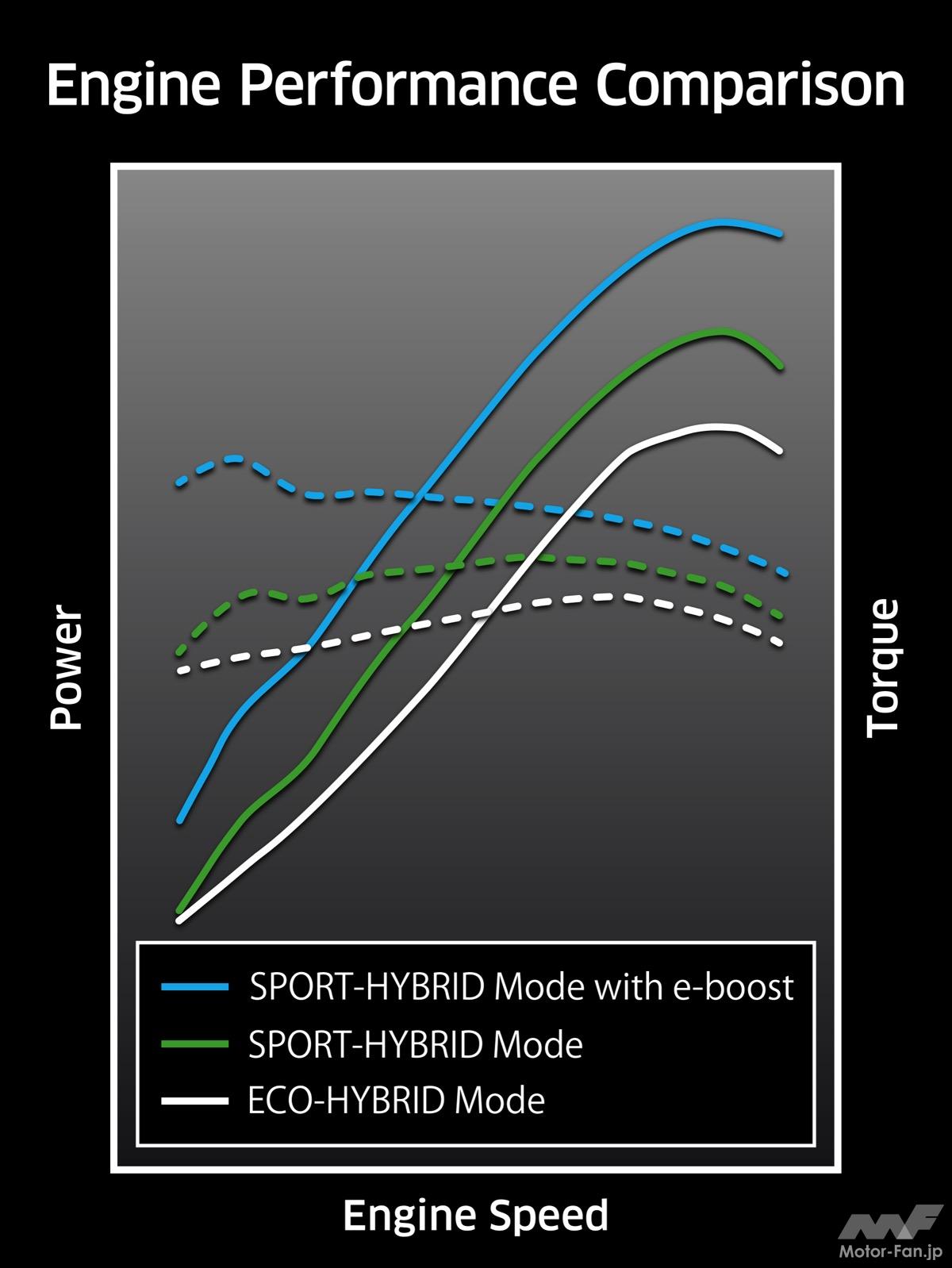 エンジンは3つの走行モードを搭載している。「SPORT-HYBRID」モードでは、エンジンとモーターのパワーを最大限に活用し、e-boost機能が一時的に出力を増加させ迅速な加速を実現する。「ECO-HYBRID」モードでは、モーターで発進し、その後エンジンが加わることで、燃費効率を重視した走行が可能である。「EV」モードでは、モーターのみでの走行が可能で、静粛性とゼロエミッションを実現している。