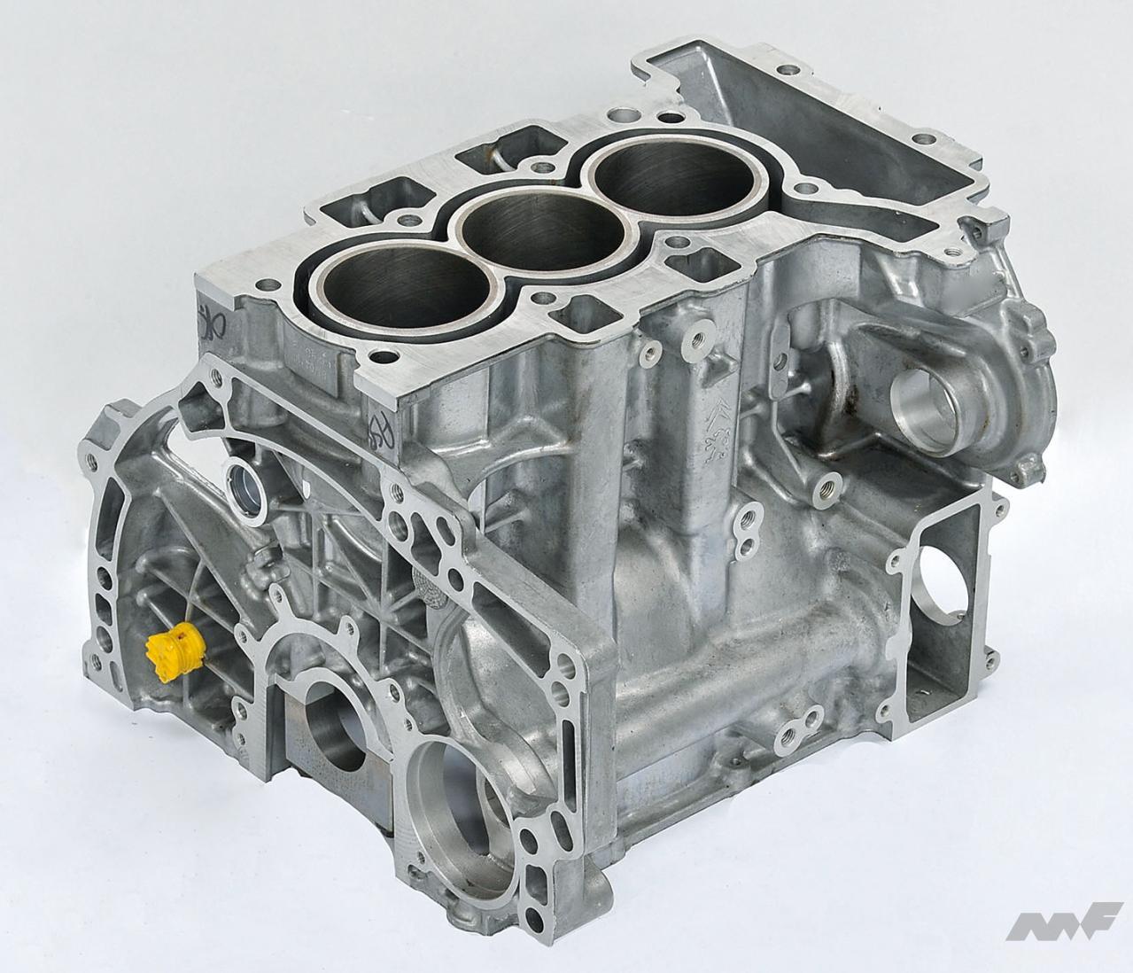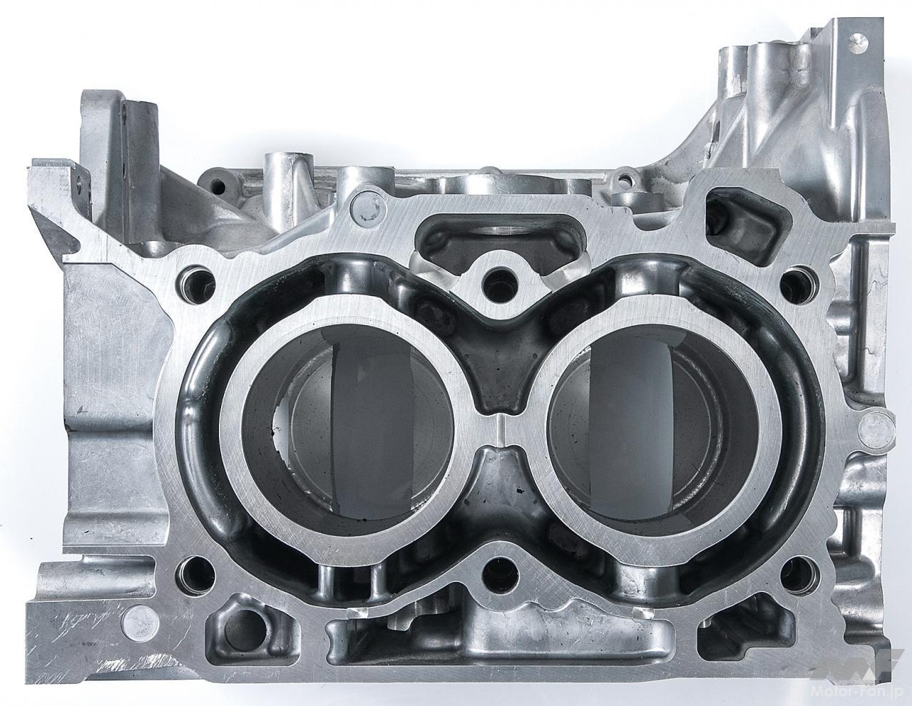 シリンダーブロック端面において、ボアまわりの水路が丸く完全に露出している構造をオープンデッキ、水路穴がボア周囲にいくつかあけられている構造をクローズドデッキと称する。断面で考えると、オープンデッキはブロック下面(下死点側)に円筒(シリンダー)が載っている/つながっている格好で、一方のクローズドデッキでは上面にも支えが多数ある作り。その構造の違いからオープンデッキはクローズドデッキに対して水量を多くすることができ、とくに冷却を施したい上死点側を積極的に冷やすことができることから、ノッキングをより回避することができるというのがメリットである。