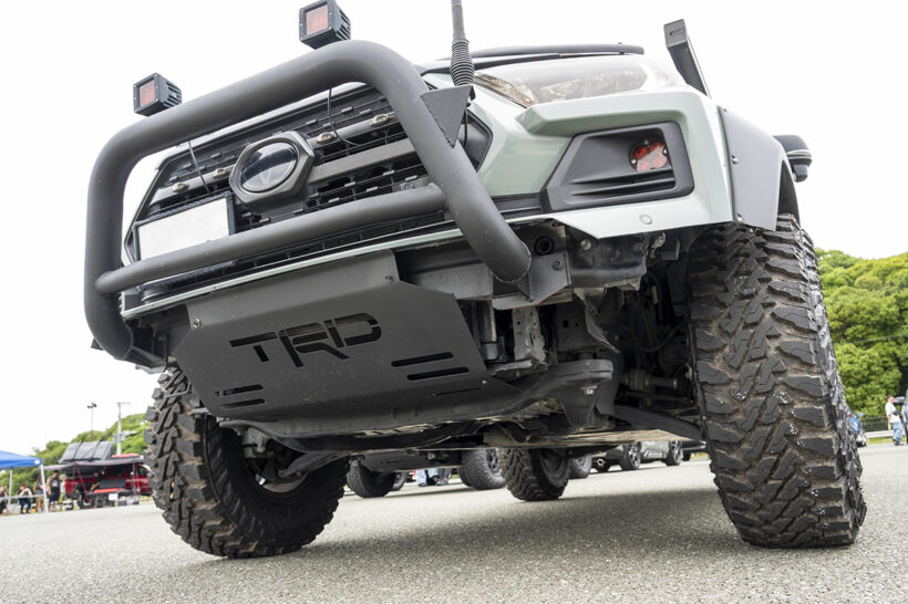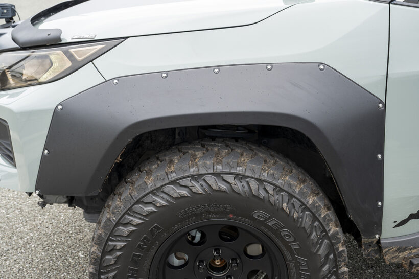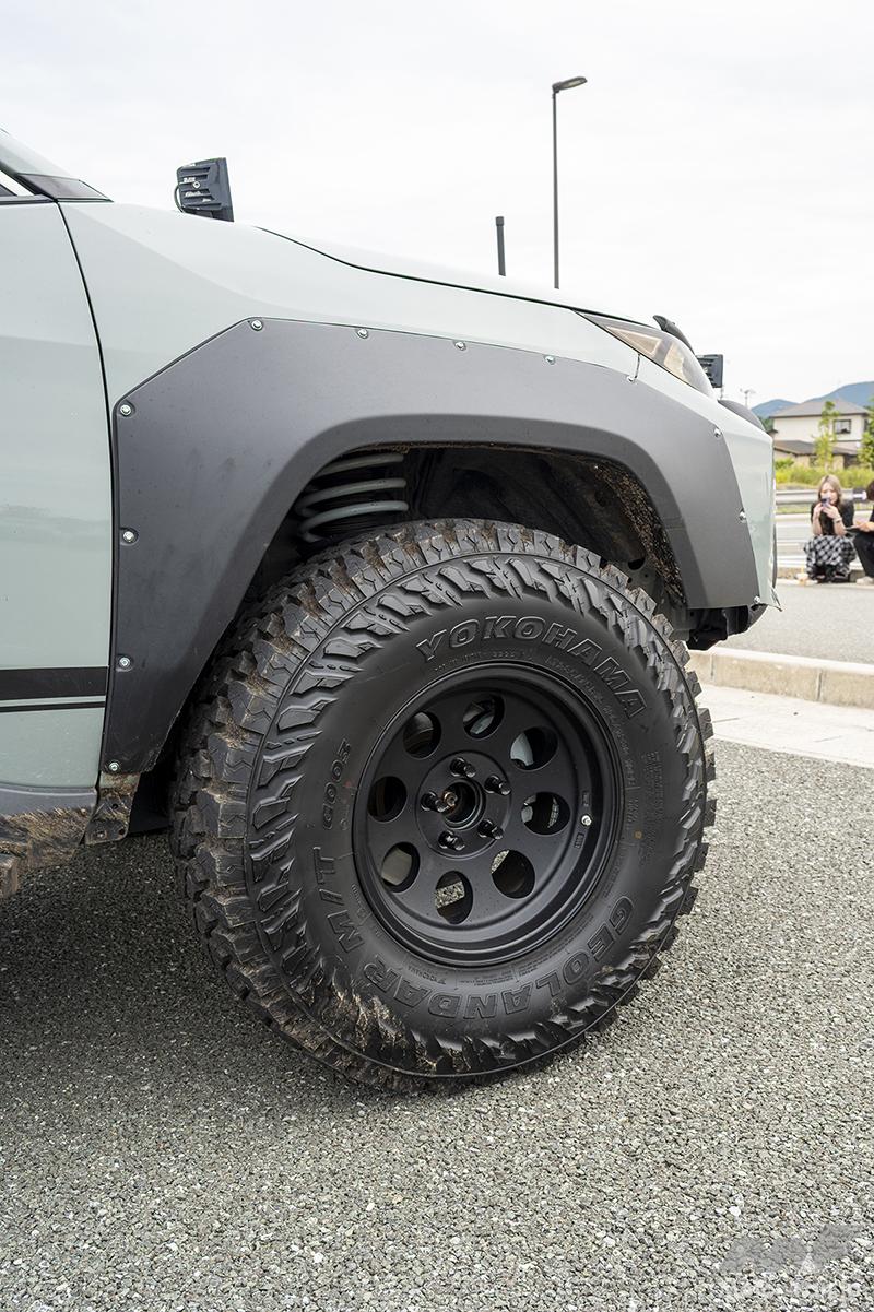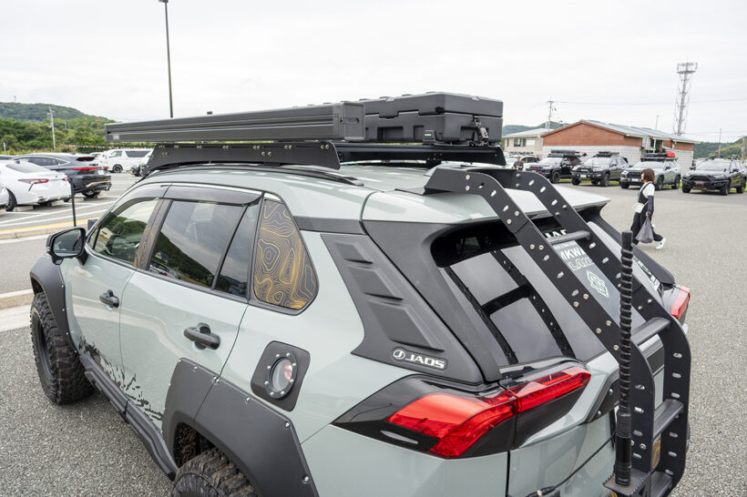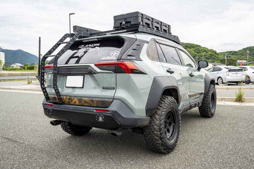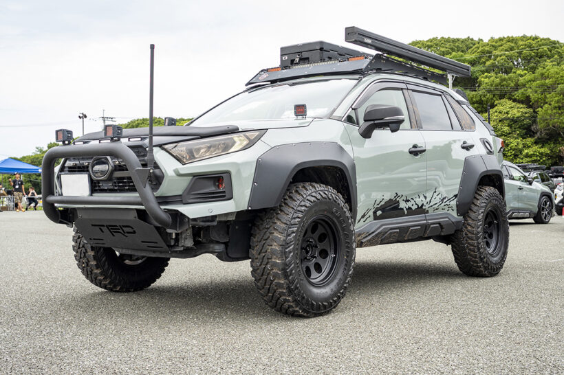 オフ会 285サイズのジオランダーM/Tを装着! リアルオフローダーな『RAV4』は悪路も林道もグイグイ走る!【写真・2枚目】 TOYOTA・RAV4/令和2年式 TOYOTA・RAV4/令和2年式 OWNER RYOYA さん 加工により思いっきり高さが上げられたネクサスジャパンのブルバー。本来アンダーフロア部分にあるスキッドプレートも純正のバンパー位置付近に取り付けられている。 ルーフラックやフィラーリッドはネクサスジャパン、リアラダーはジョリーロジャースをセレクト。 リフトアップ状態の車高で公認を取得しているため、バックランプはバンパー下段部に移設。なんか、カッコイイぞ! この画像の記事を読む