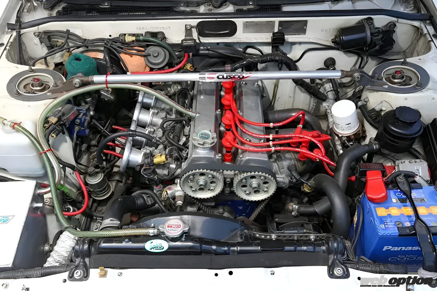 エンジンは戸田レーシングの鍛造ピストンや強化コンロッドこそ組み込んでいるものの、高回転まで気持ち良く回るようにするため、あえて排気量を1.6Lのままとされた200馬力仕様。AE101純正の4連スロットルに加え、304度というハイカムを入れているが、フリーダムECU(フルコン)ならアイドリングは問題なく安定するという。