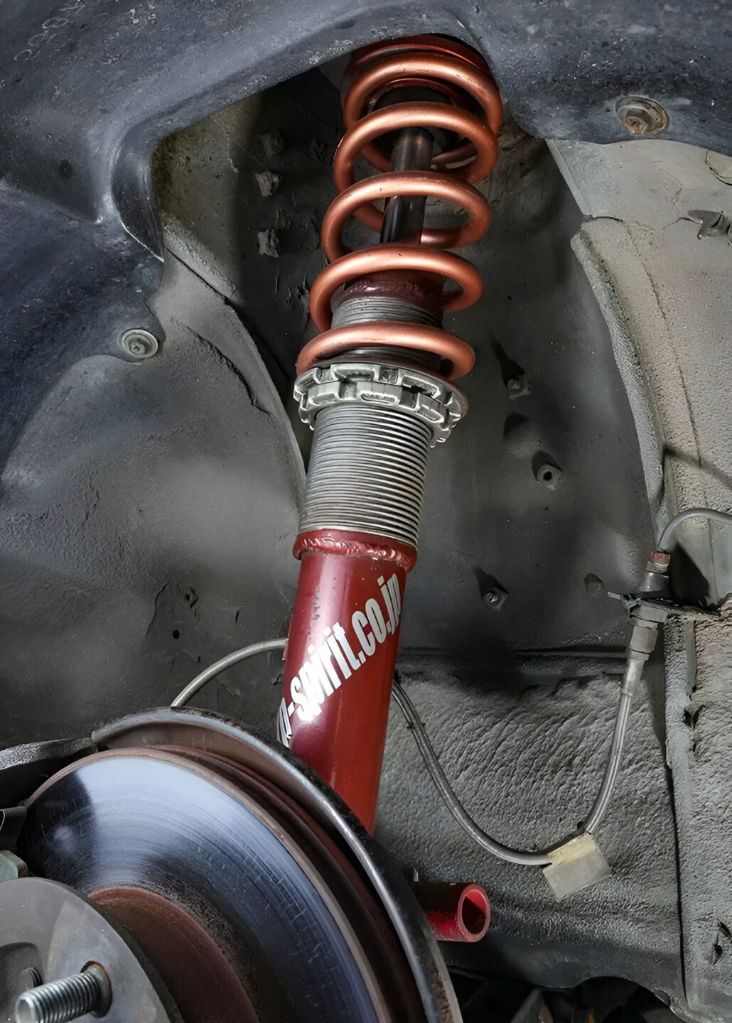 車高調はトキコ製ショックをベースにしたテクノプロスピリッツオリジナル。スプリングレートはフロント8kg/mm、リヤ6kg/mmの設定だ。この辺りが乗りやすさと走行性能のバランスに優れているそう。