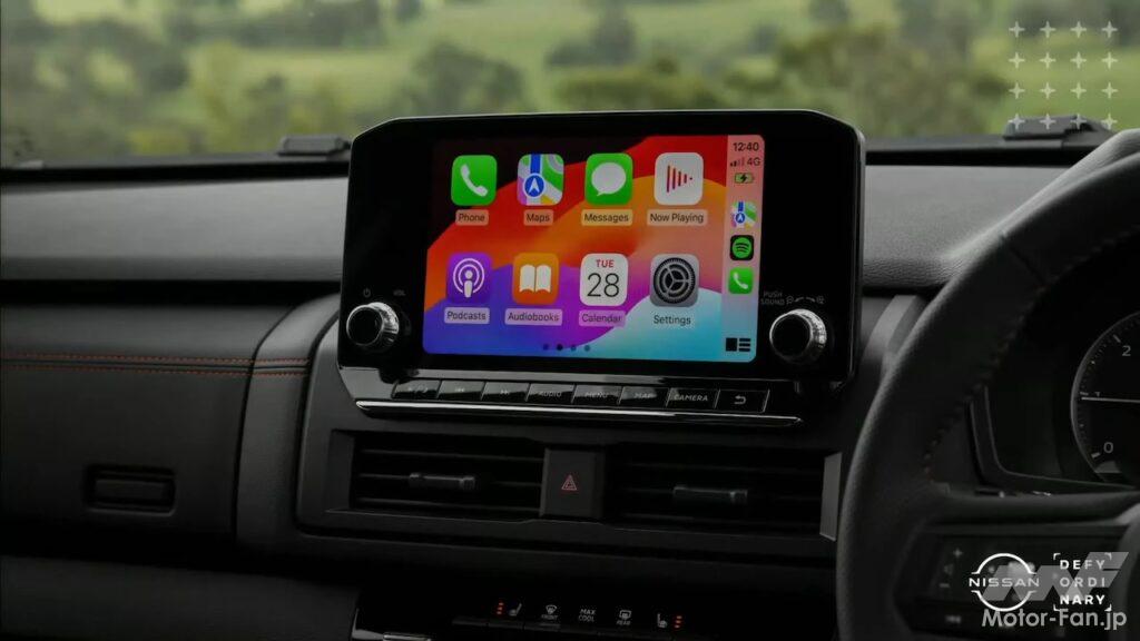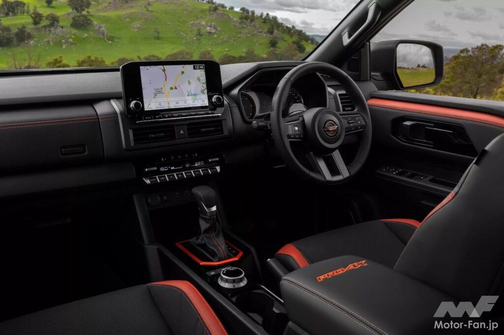 ダッシュボードには、最新の9インチインフォテインメントシステムが搭載され、最新の運転支援技術と後部座席の足元スペースの拡大が図られている。Pro-4X仕様では、赤いステッチとアクセントが入ったレザーシートがインテリアに採用されている。