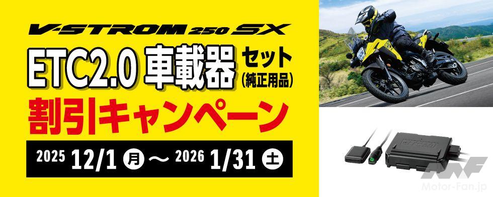 対象期間は2025年12月1日(月)~2026年1月31日(土)である。対象車種は2023~2025年モデルの国内認定新車Vストローム250SX。海外向け輸入車は対象外である。