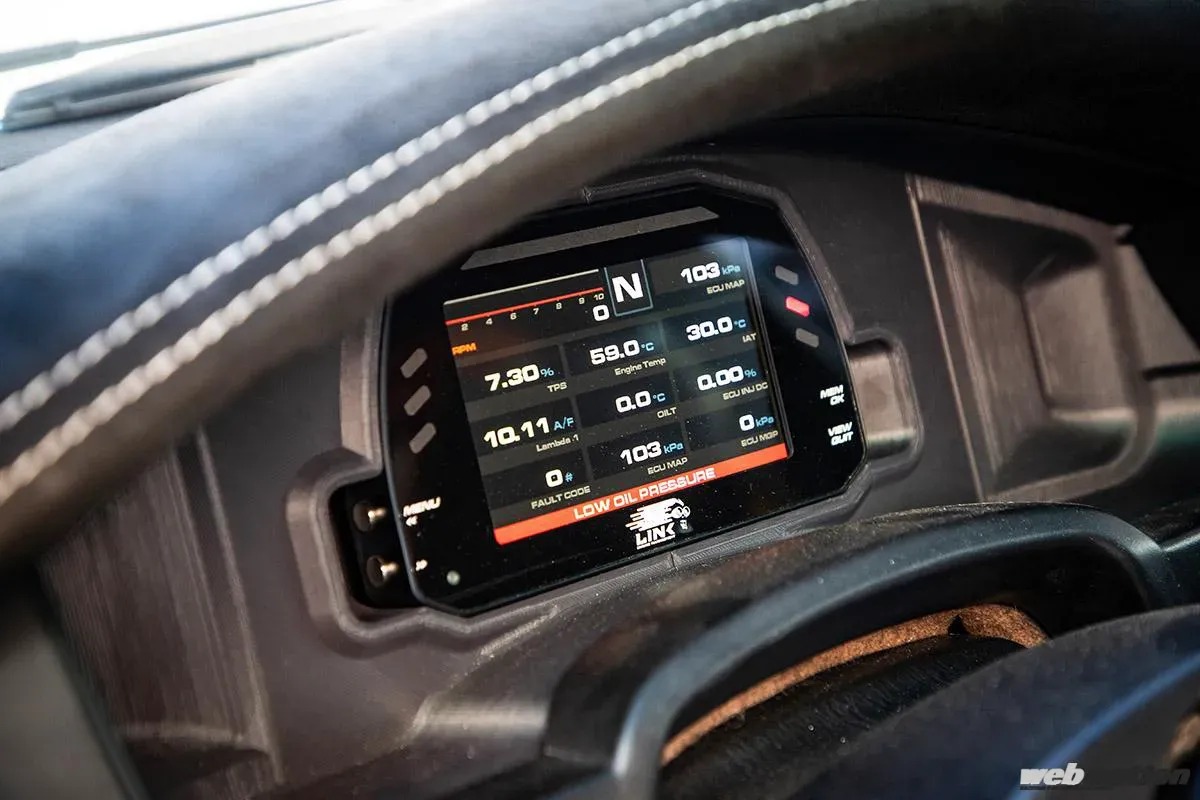 メーターはLINKのダッシュディスプレイを使用。メータークラスター内にピッタリと収まるカバーも3Dプリンターで製作されている。センターコンソールには車高調整用のコントローラーを、リヤのトランク内にはエアサスのタンク、コントローラー、コンプレッサーなどを備える。