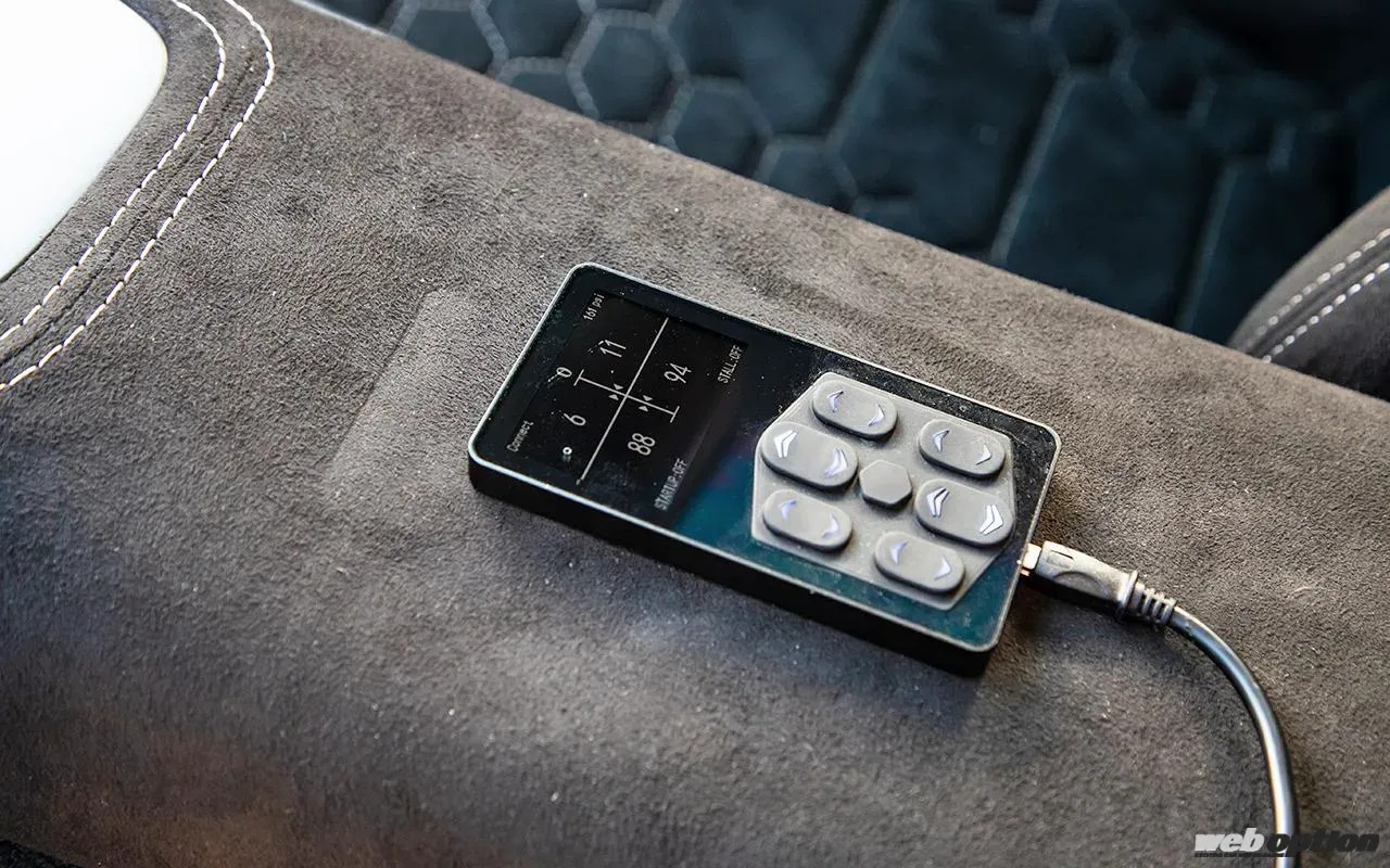 置きでも走りでも、それぞれの理想の車高を生み出せるAirtekk製エアサスペンションも採用。四輪独立で高さ調整できるシステムで、トランクルームに電磁弁コントローラーなどの制御ユニット、室内にリモートコントローラーを備える。