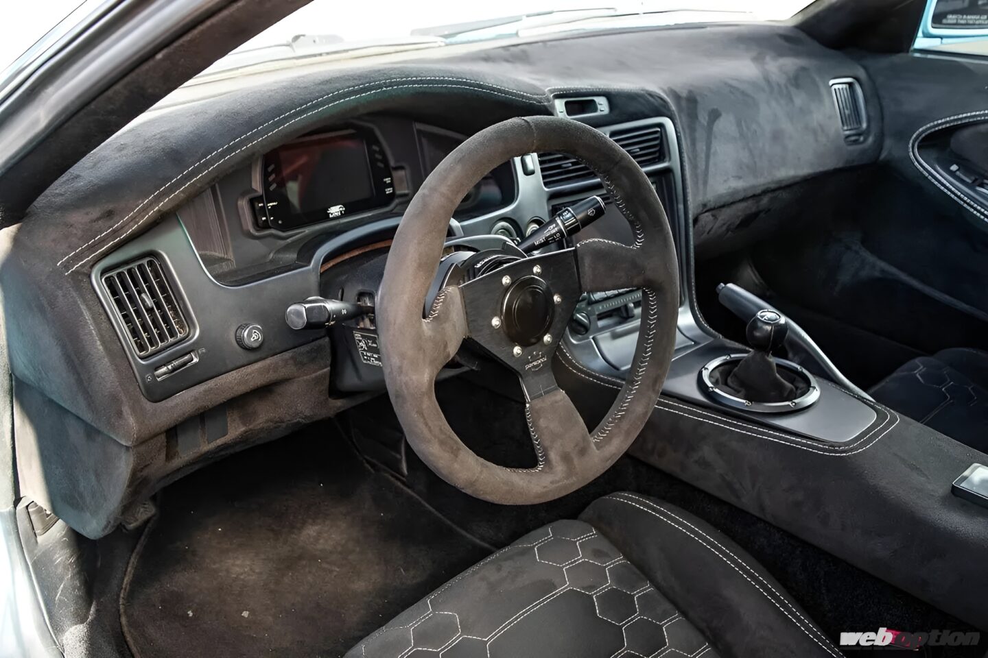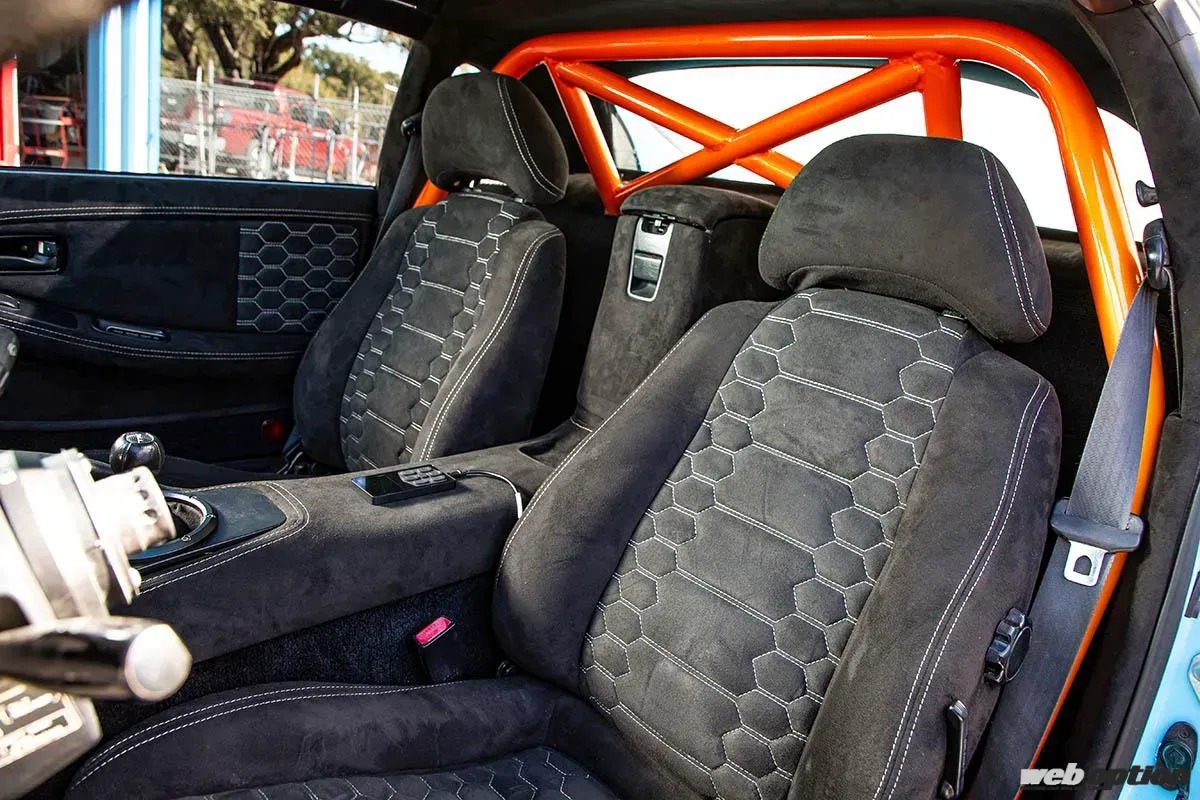 DVPデザインが手掛けたフルカスタムのスウェード内装。シートは純正をベースに表皮が張り替えられ、ステッチで六角形を表現したモチーフが背もたれと座面、ドアトリムの一部に使用されている。