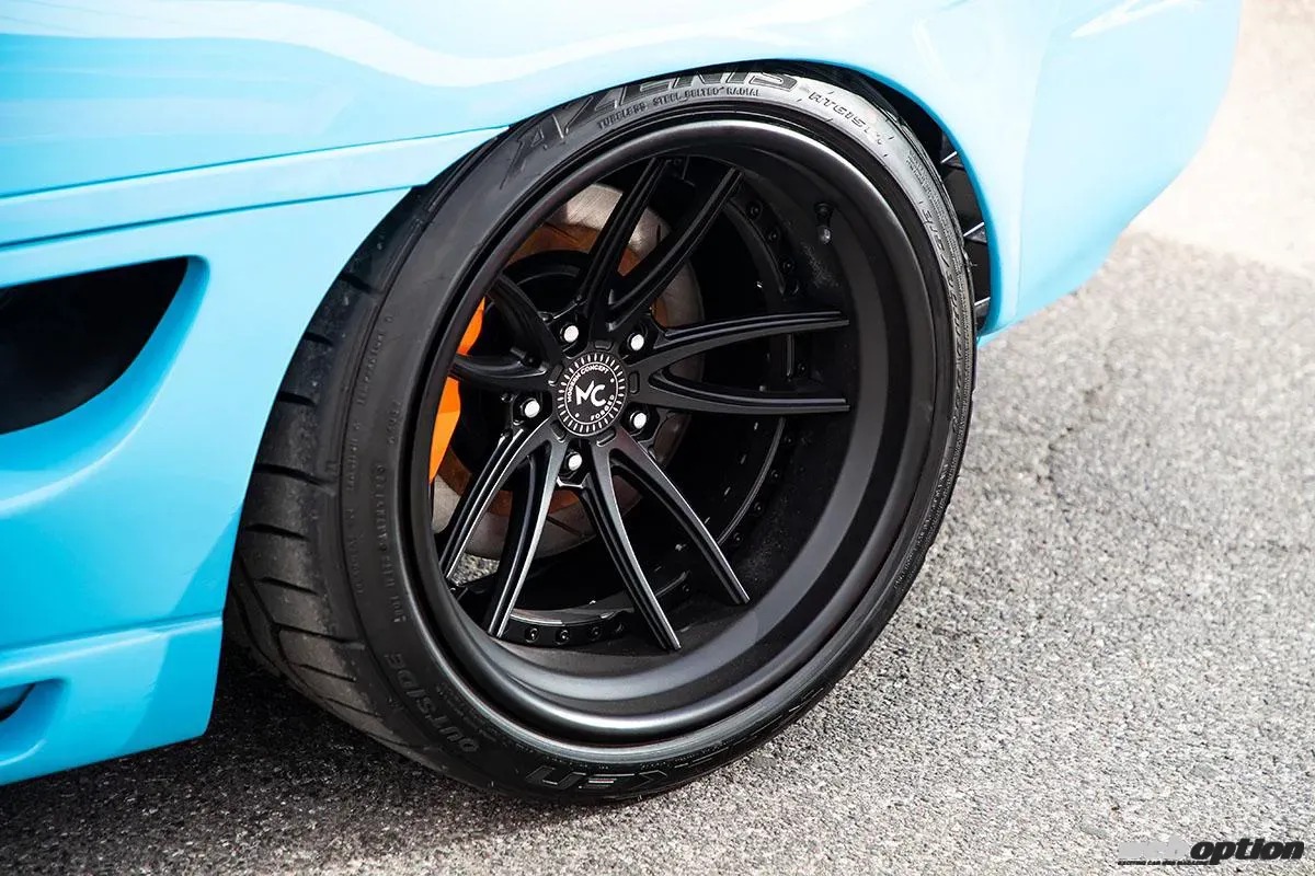 ホイールはこのフェンダーに合わせてアメリカの鍛造メーカー、Modern Concept Wheelsが製造したカスタムサイズオーダーの18インチ。リム幅とオフセットを前後のフェンダーに合わせた結果、フロントが8.5Jプラス15×18、リヤが12.5Jプラマイ0×18となる。特にリヤはスポークにコンケーブがついた深リムを実現しており、12.5Jのリム幅に315/30R18のタイヤを組む。