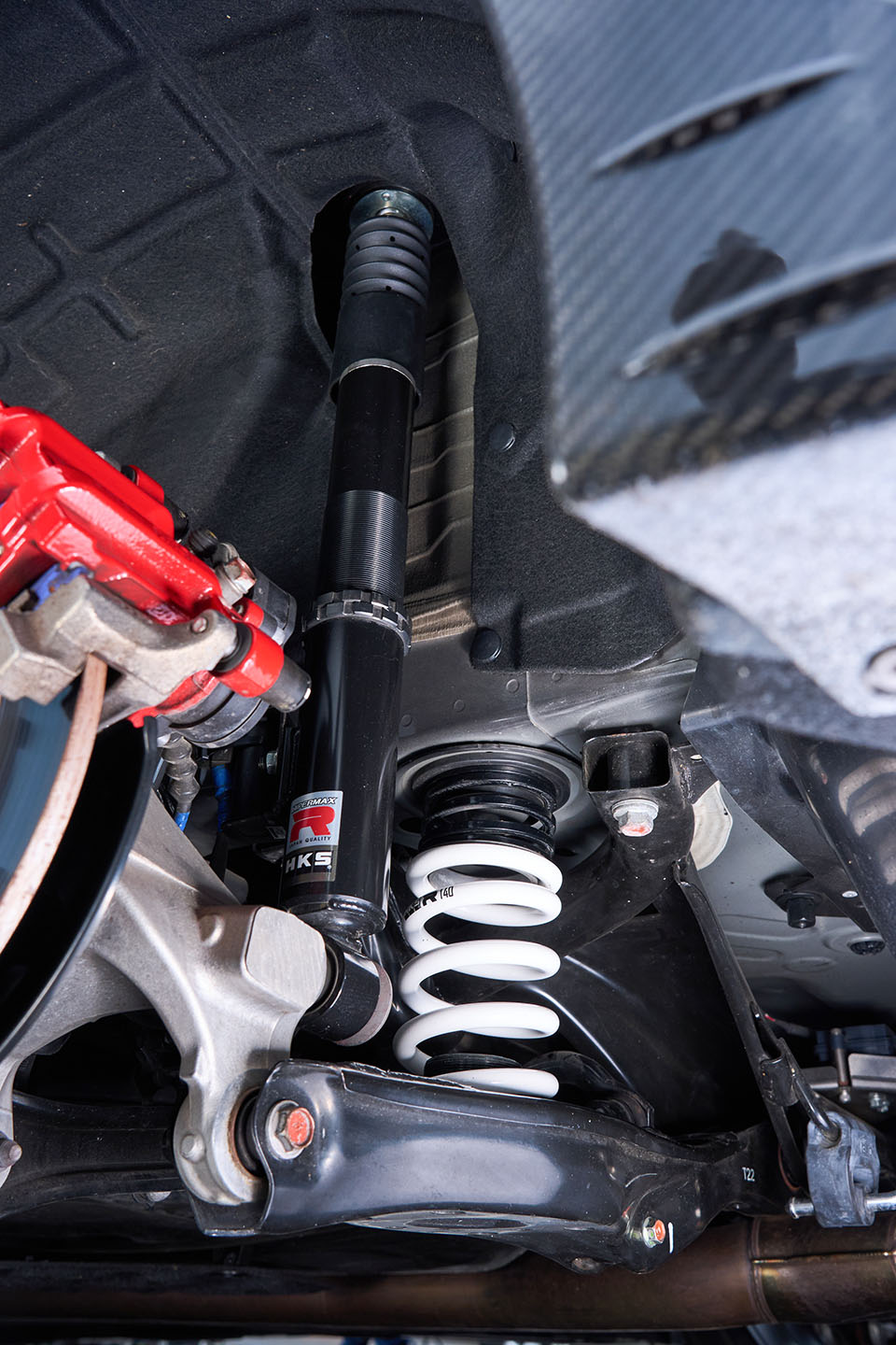 足まわりには、専用ダンパーフルードと低振動スプリングを採用したハイパーマックスRを装着。前後14kg/mmのスプリングレートとサスペンションエラーキャンセラーが付属し、スポーツ性能と快適性を高次元で両立する。
