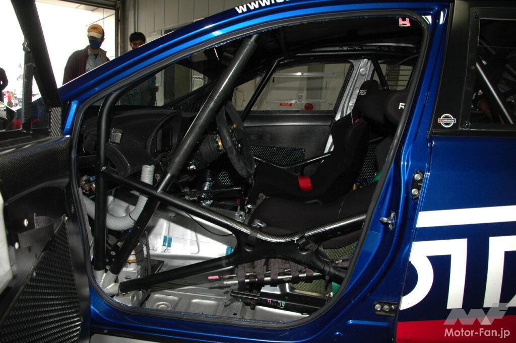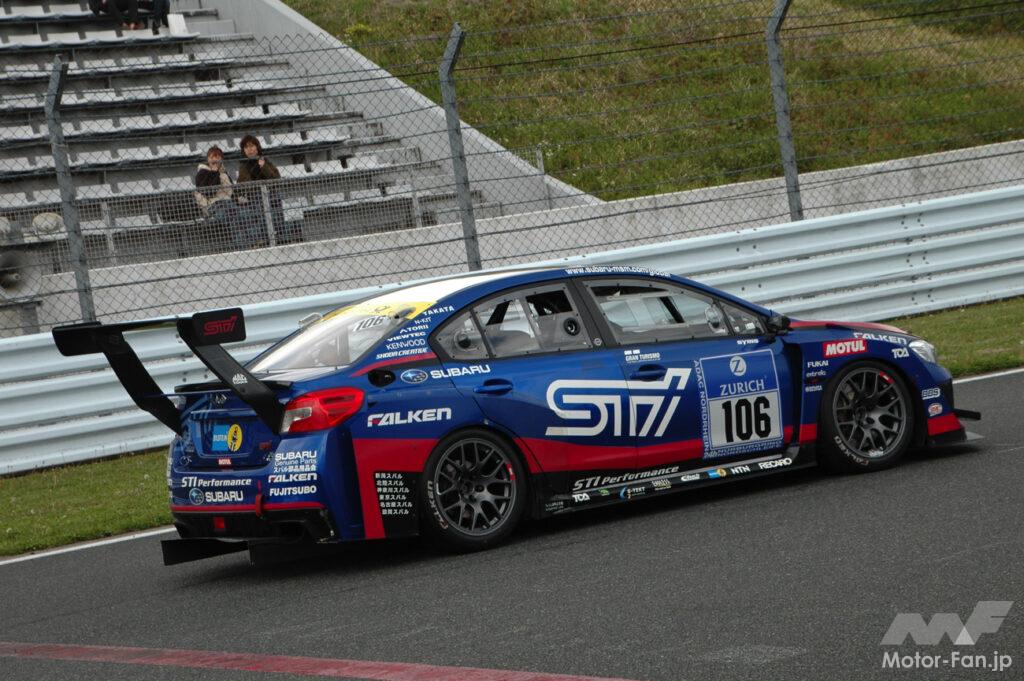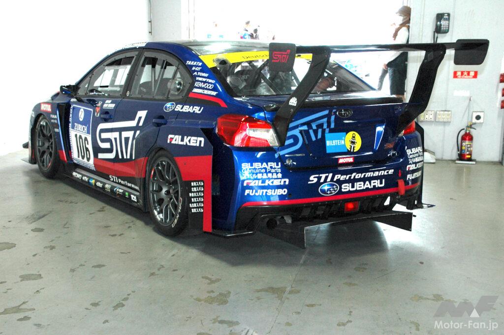 外装はニュルブルクリンク24時間耐久レースを戦うための改造が施されているものの、よく見ればこのクルマが市販のWRX STIであることは明らか。その改造もどこか手作り感のある雰囲気を漂わせている。