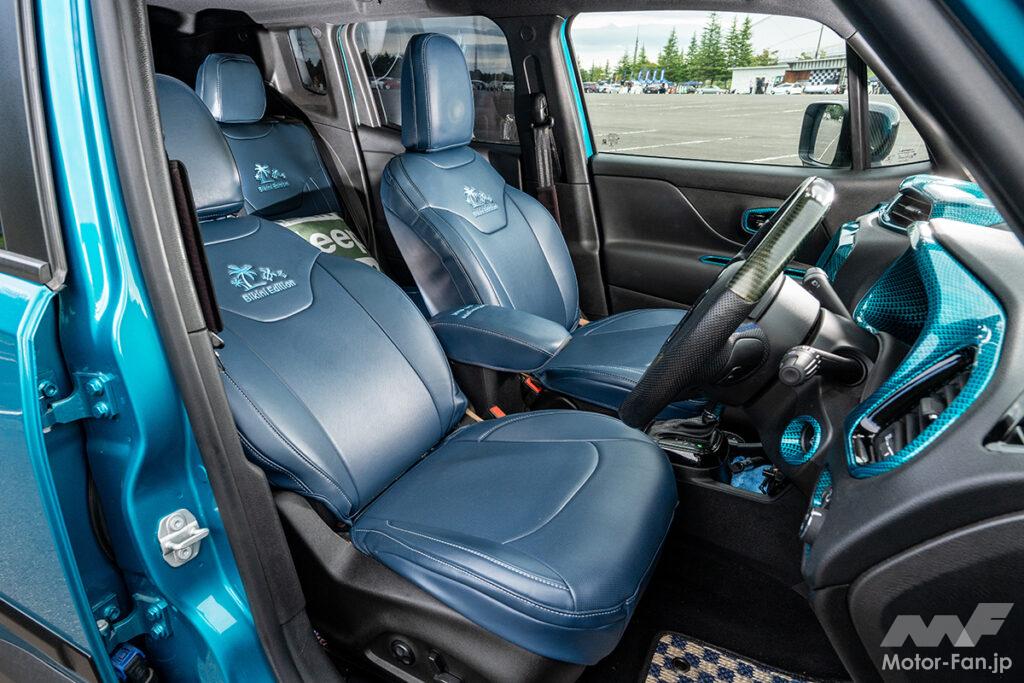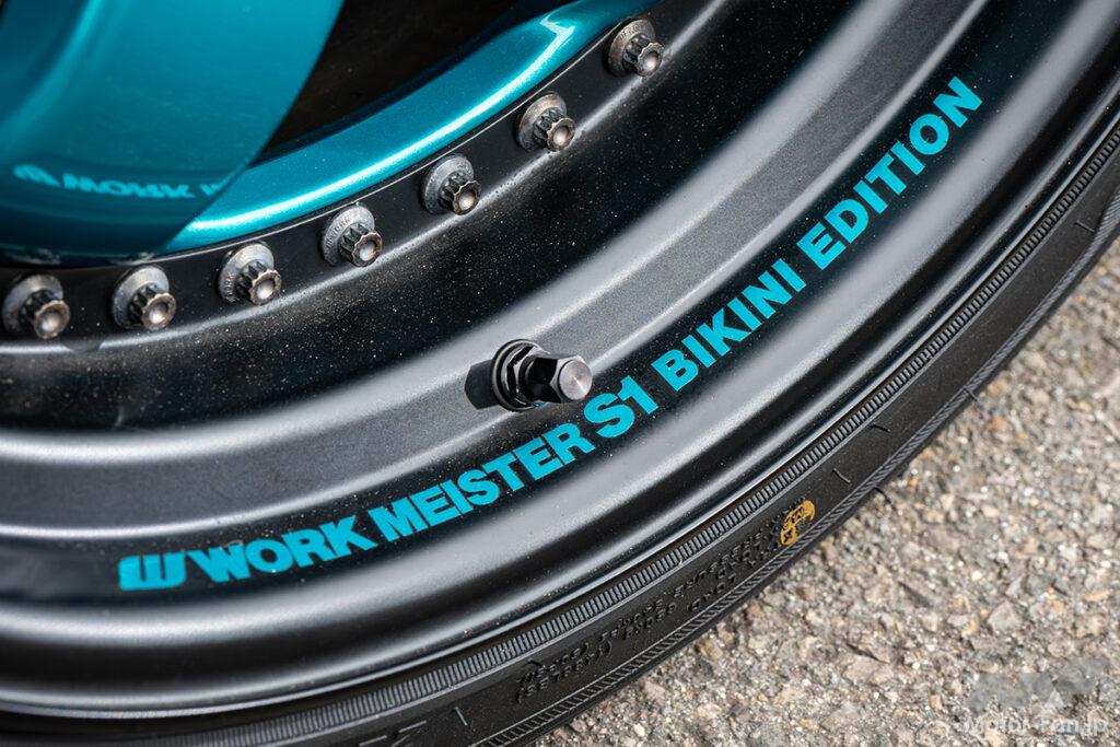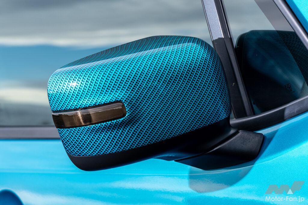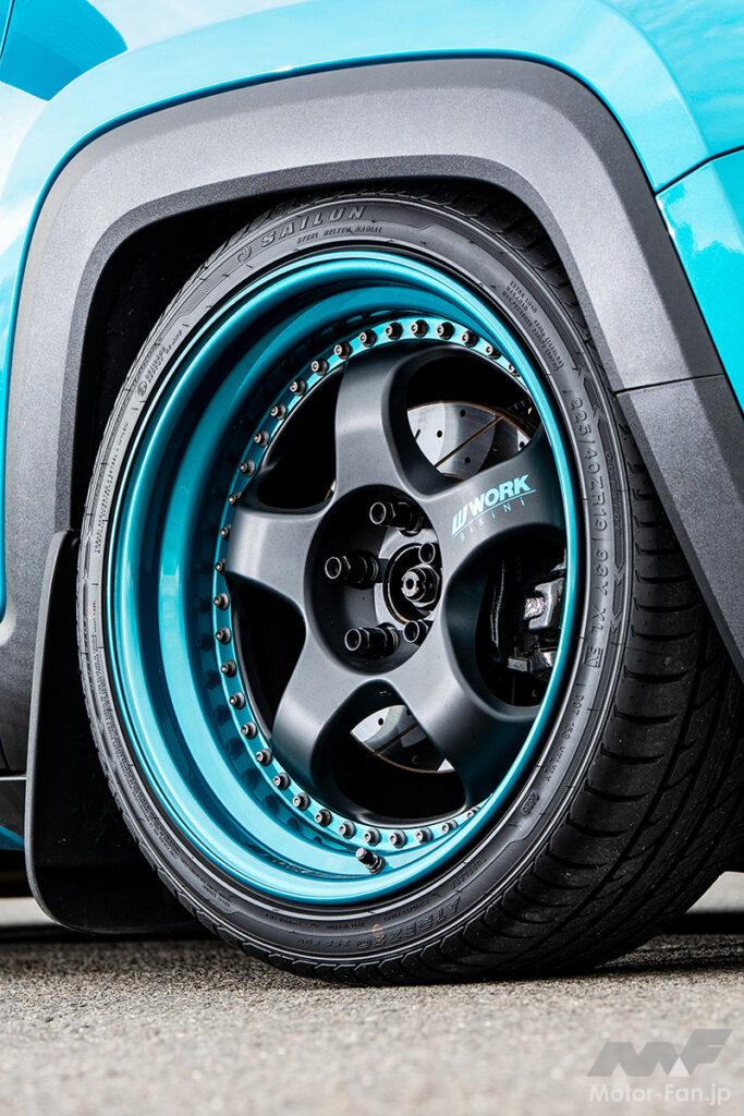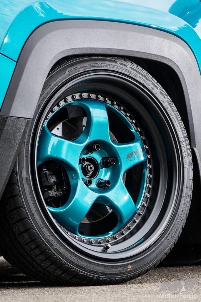 パーツが無いならカラーコーデで差別化を図るコンセプトは、かつて「BIKINIエディション」として限定販売されたターコイズブルーのボディカラーを最大限までフューチャー。その個性的な「緑がかった青」を武器にホイールは左右非対称のボディ同色ペイントを施し、前後パンパーやサイドステップはボトムをターコイズブルー塗装することで社外エアロを装着したかのような視覚的効果も生み出している。