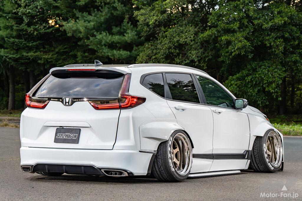 世界に唯一の自作ブリスターフェンダーとエアサスを駆使したローフォルムで、SUVらしからぬアグレッシブな風貌をゲットしたCR-V。米国Adro社製BMW(M4クーペ)用ボディキットに感銘を受けて創造されたエアロフォルムは、あくまでも「履きたいホイール有りき」で製作された異端児とも言える。ワーク・マイスターL1の最大リム幅11.5J(約30センチ)を飲み込むため、発泡ウレタンによるクレイモデル製作を経てオーナー芳賀氏の手によってFRP成形されているのだ。