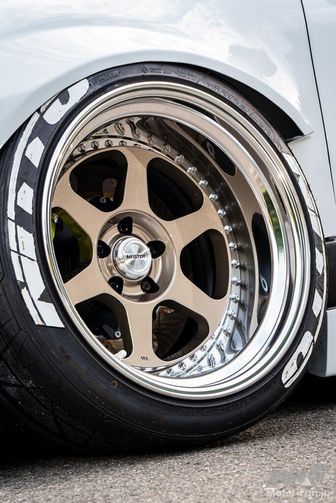主要SPEC ■ホイール:ワーク・マイスターL1(19×11.5J) ■タイヤ:ニットー(275/35) ■エクステリア:ニコイチFRバンパー&フロントフラップ&フェンダー&サイドパネル=ワンオフ、グリル&サイドミラー=US仕様 ■チューニング:エアサス=ロームエア、マフラー=ワンオフ
