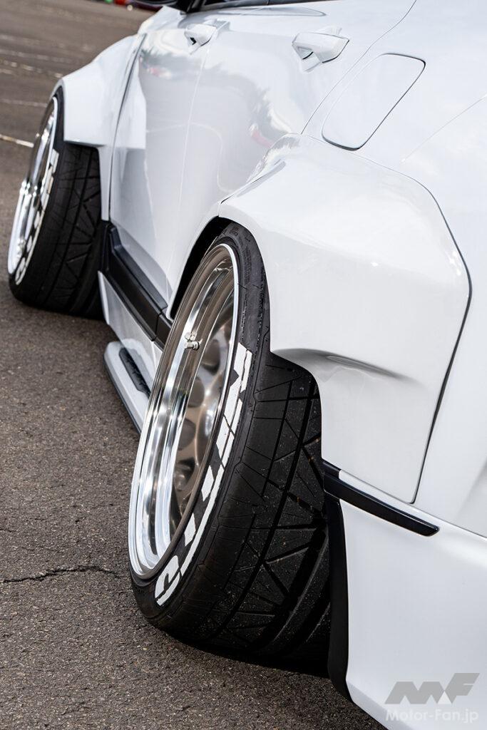 主要SPEC ■ホイール:ワーク・マイスターL1(19×11.5J) ■タイヤ:ニットー(275/35) ■エクステリア:ニコイチFRバンパー&フロントフラップ&フェンダー&サイドパネル=ワンオフ、グリル&サイドミラー=US仕様 ■チューニング:エアサス=ロームエア、マフラー=ワンオフ
