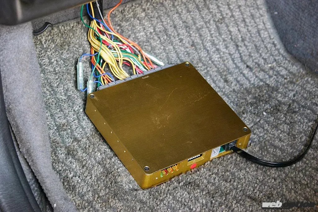 ECUにはF-CON Vプロを使っているが、VQ30DETには専用ハーネスの設定がないため配線を1本1本繋いで接続。エアフロレス化はもちろん、燃調と点火時期の最適化を図っている他、スタート時のミスファイアリング(点火カット)も制御している。