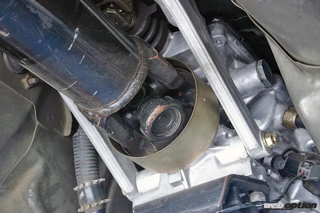 プロペラシャフトはY33用をショート加工したものだが、ミッションに差し込まれる部分のスプライン形状が異なっている。そこでZ33用プロペラシャフトを取り寄せ、先端だけをY33用プロペラシャフトに組み合わせて使っているのだ。