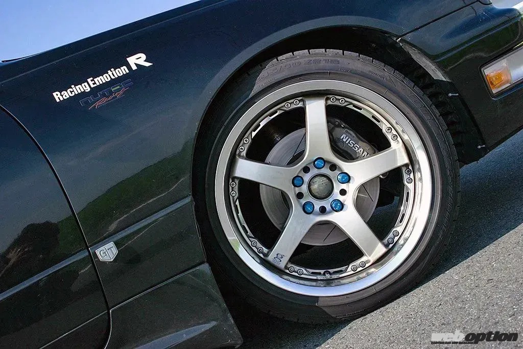 ホイールはレイズのG-games77W、タイヤはフロント245/45-18、リヤ255/35-18サイズのポテンザが組み合わされる。フェンダー後端のモール部に付けられたスカイラインのGTバッジがアクセントだ。