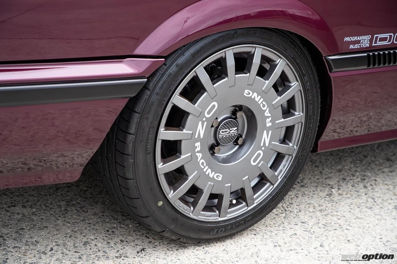 深みのあるボディカラーは、ライフやバモスなどに採用されるプレミアムクリスタルローズ・パールだ。ホイールはメルセデス・ベンツ190EなどDTMでも装着されたOZ・ラリーレーシングをセレクトする。ブレーキはNSXからの流用とのこと。