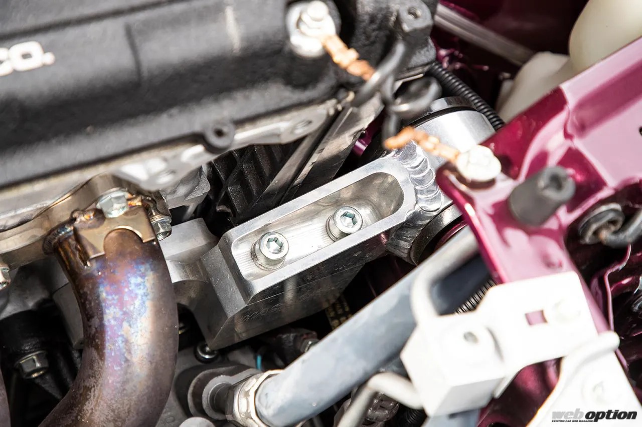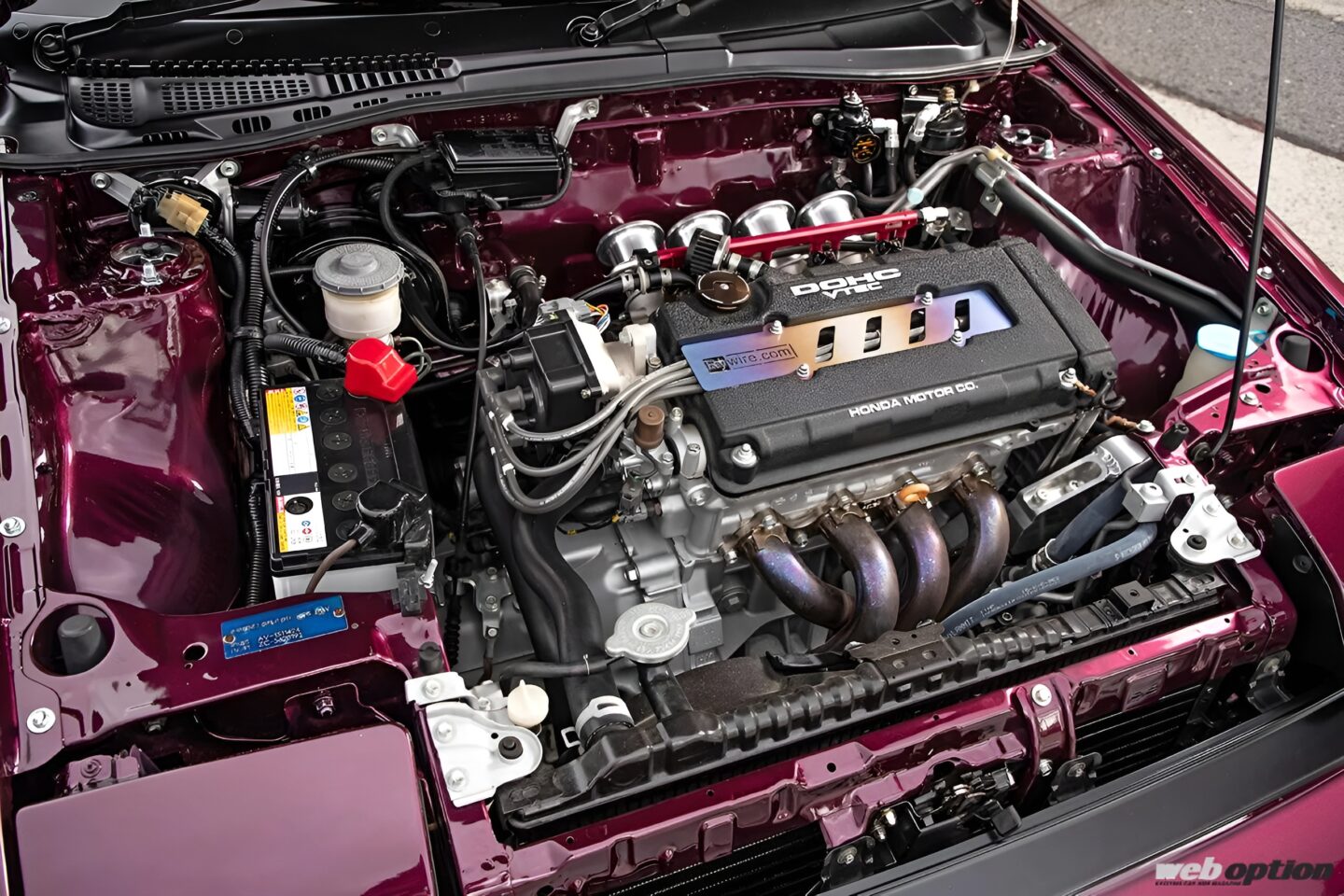 エンジンは4連スロットル化したB18C・96スペックRに換装。ヘッドには戸田レーシングのAカムとバルブスプリングが投入され、排気系は戸田レーシング製エキマニと大阪JDMワンオフマフラーを装備。制御はB18C純正ECUの書き換えで行なっている。