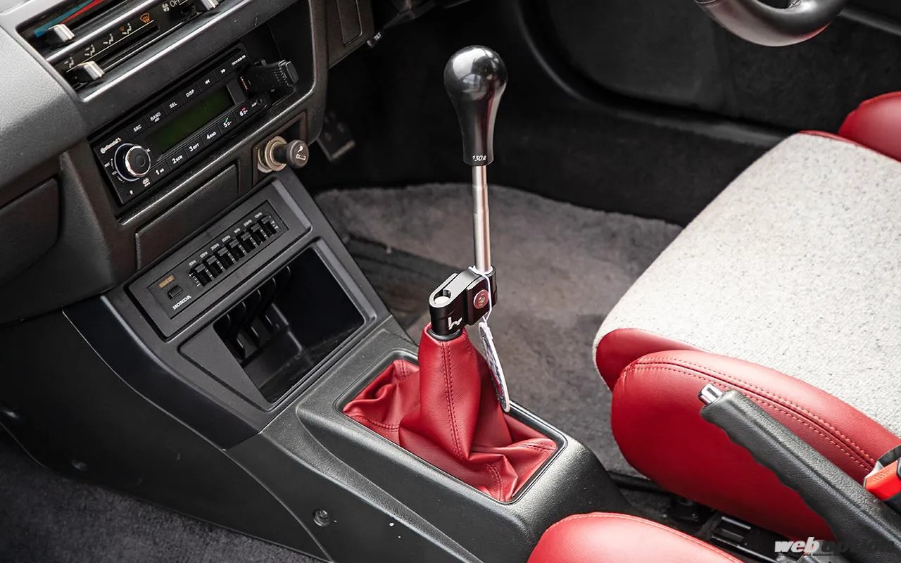 ボディカラーに合わせたレザーと、グレーのツイードで張り替えられたインテリア。メーターをアキュラ・インテグラ用に交換する他、メーターグリップロイヤルのステアリング、ハイブリッドレーシングのシフター、コンチネンタルのBluetooth対応1DINデッキを装備。